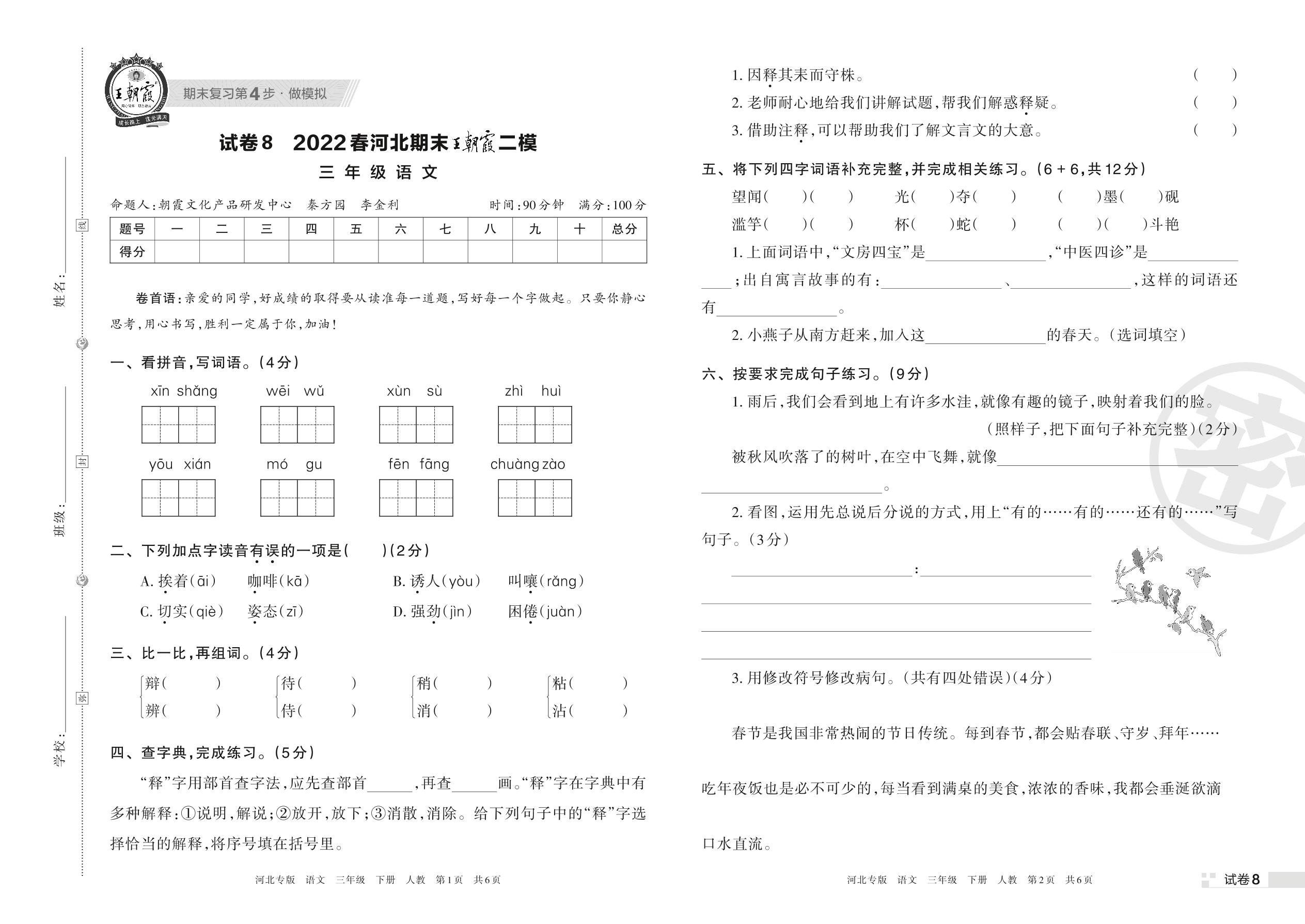王朝霞期末模拟卷三年级下册语文(人教版)_R220329091759162【8】