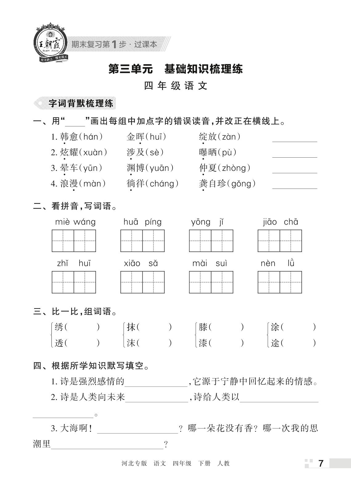 王朝霞期末过课本——第三单元 基础知识梳理练四年级下册语文(人教版)_R220329092406976