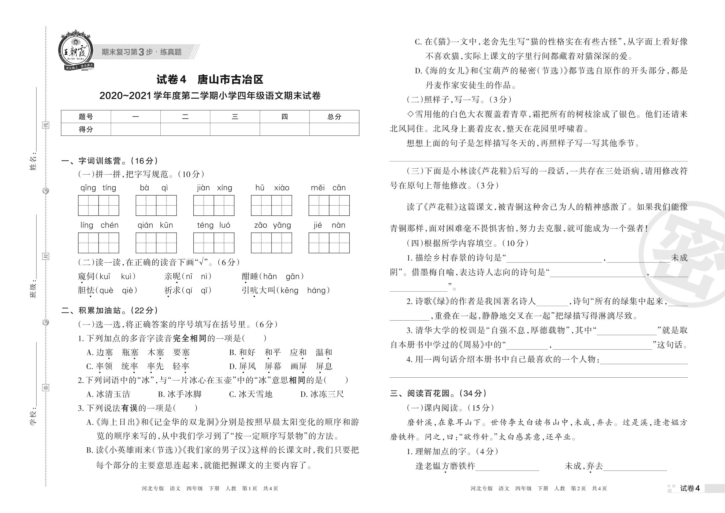 唐山市古冶区2020~2021学年度第二学期小学四年级语文期末试卷(人教版)【4】