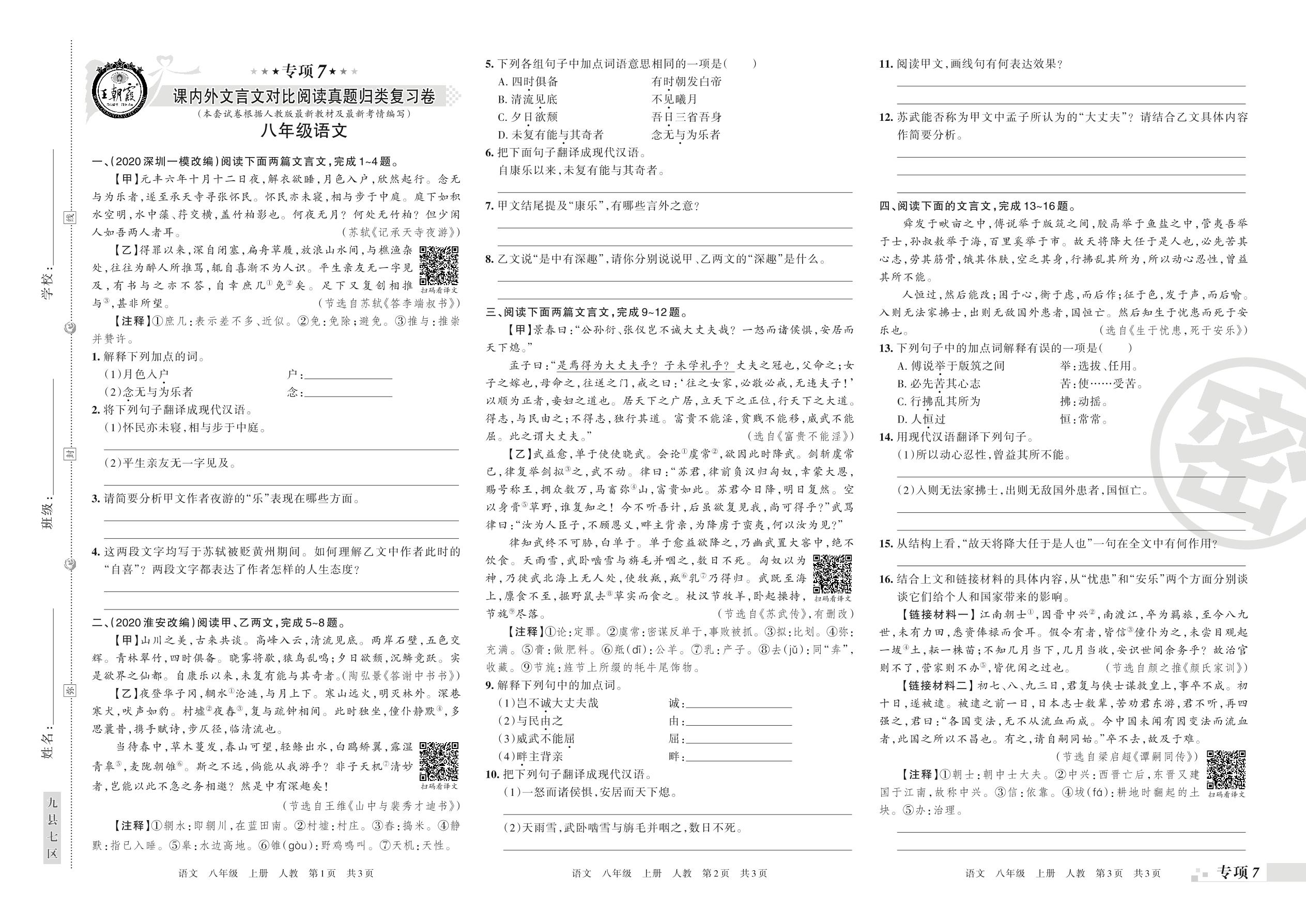 王朝霞期末专项卷——课内外文言文对比阅读、古诗词阅读真题归类复习八年级上册语文(人教版)_R21080214404【0】