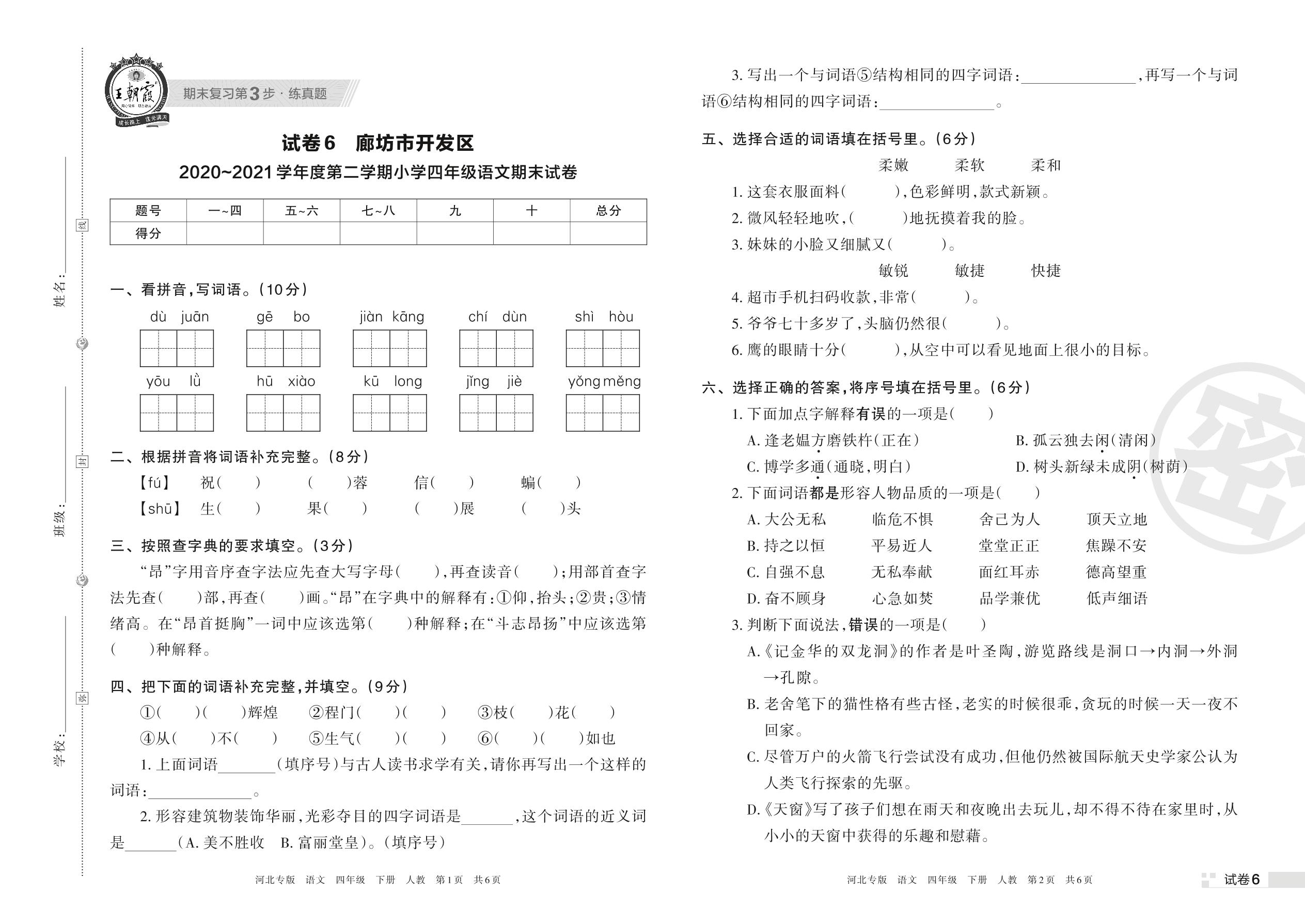 廊坊市开发区2020~2021学年度第二学期小学四年级语文期末试卷(人教版)【6】