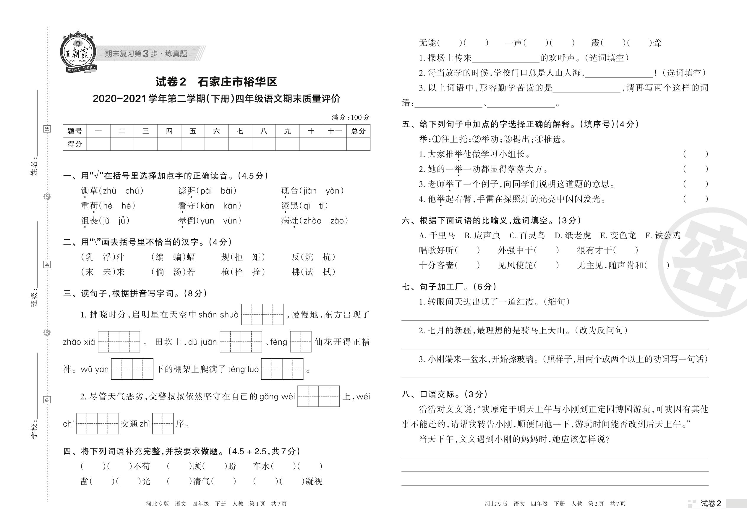 石家庄市裕华区2020~2021学年第二学期(下册)四年级语文期末质量评价(人教版)【2】