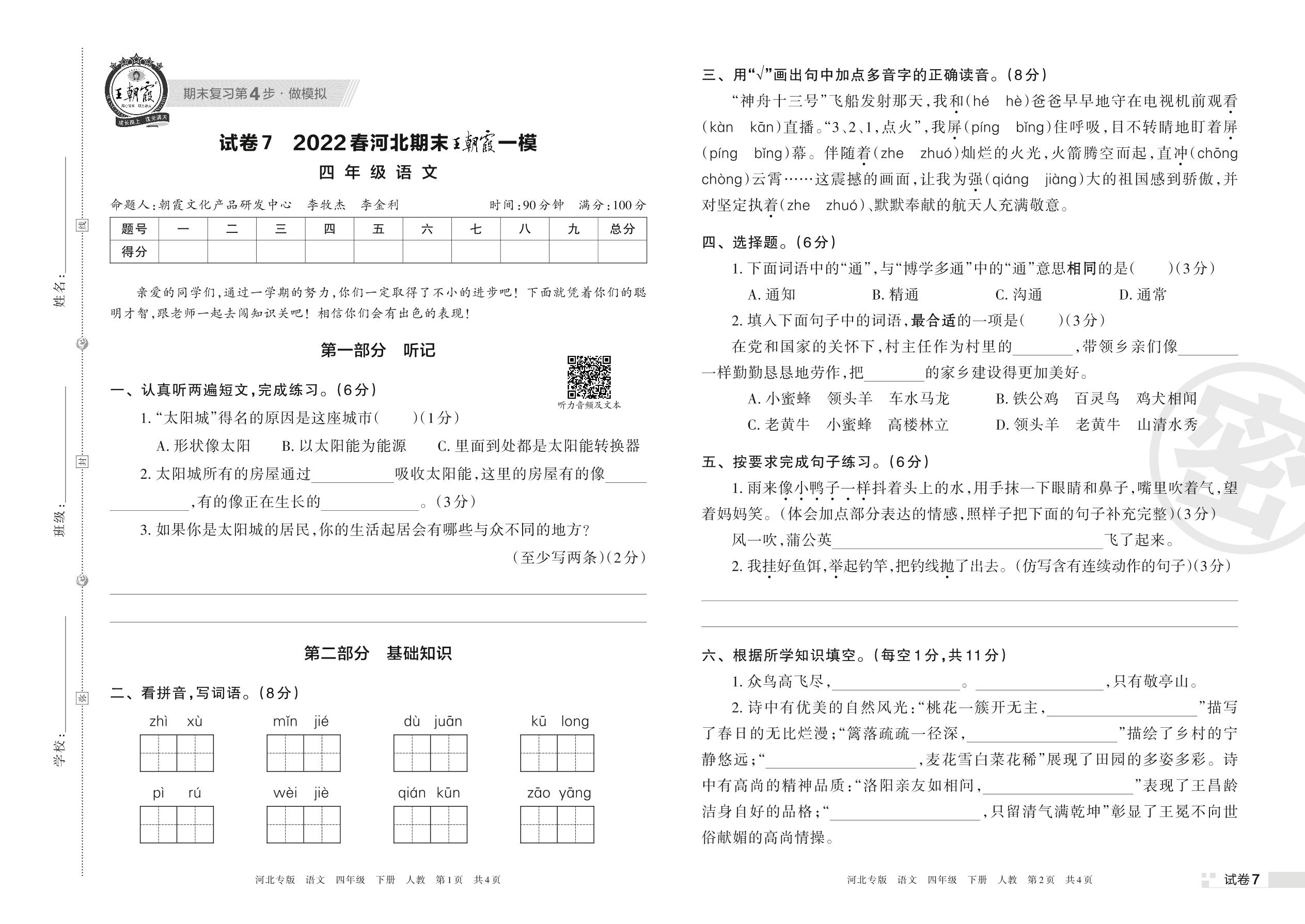 王朝霞期末模拟卷四年级下册语文(人教版)_R220329092408031【7】