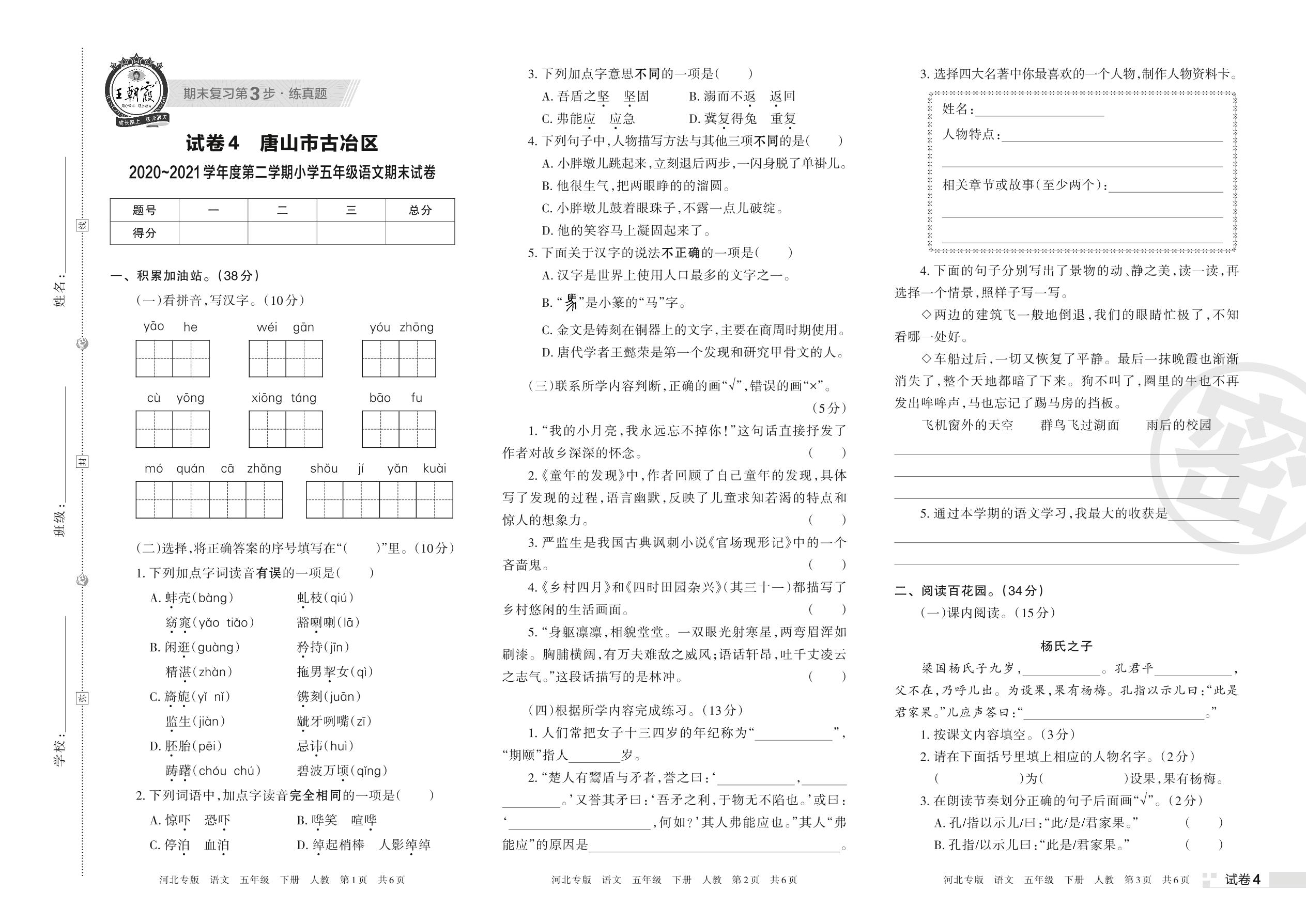 唐山市古冶区2020~2021学年度第二学期小学五年级语文期末试卷(人教版)【4】