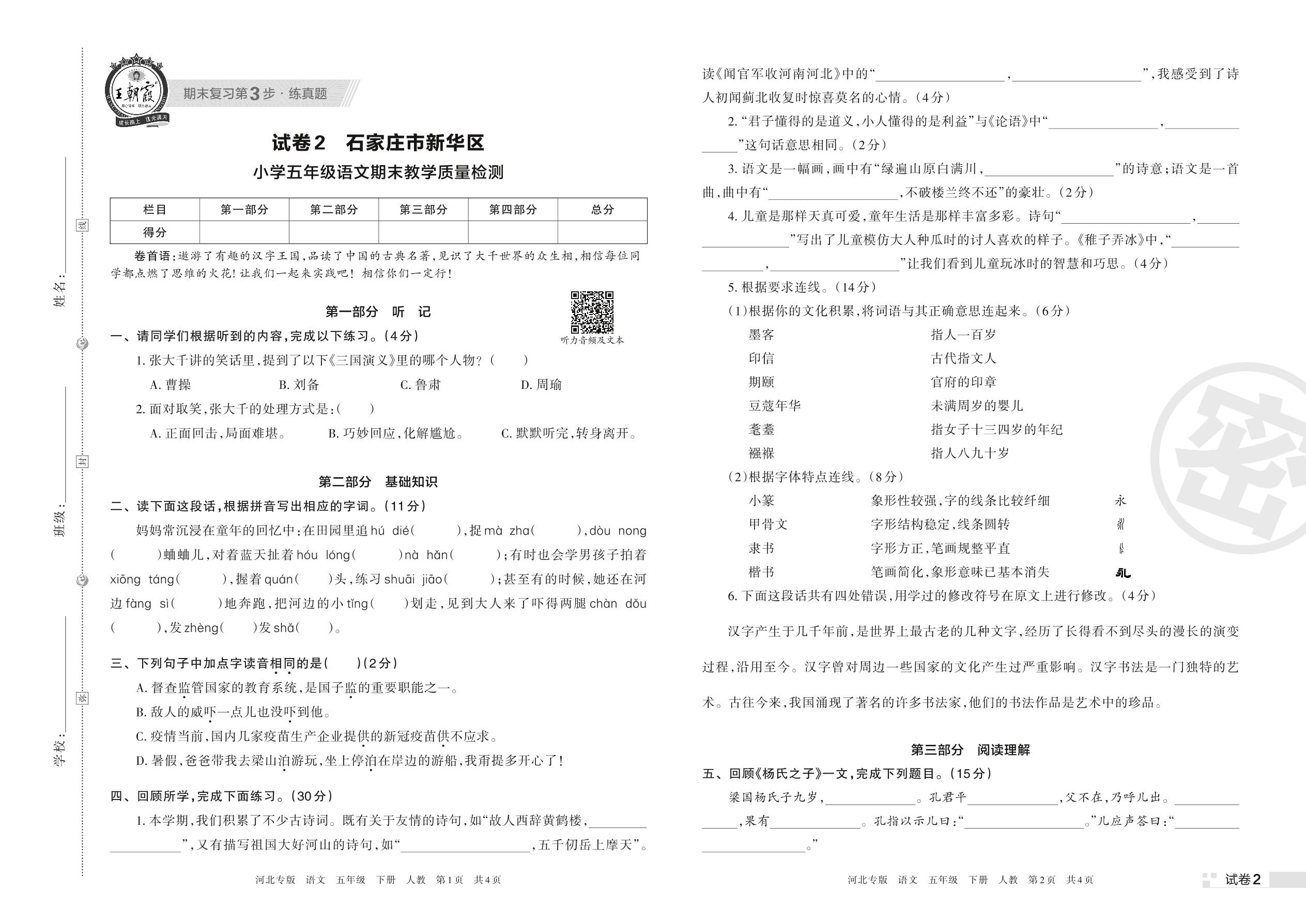 石家庄市新华区小学五年级语文期末教学质量检测(人教版)【2】