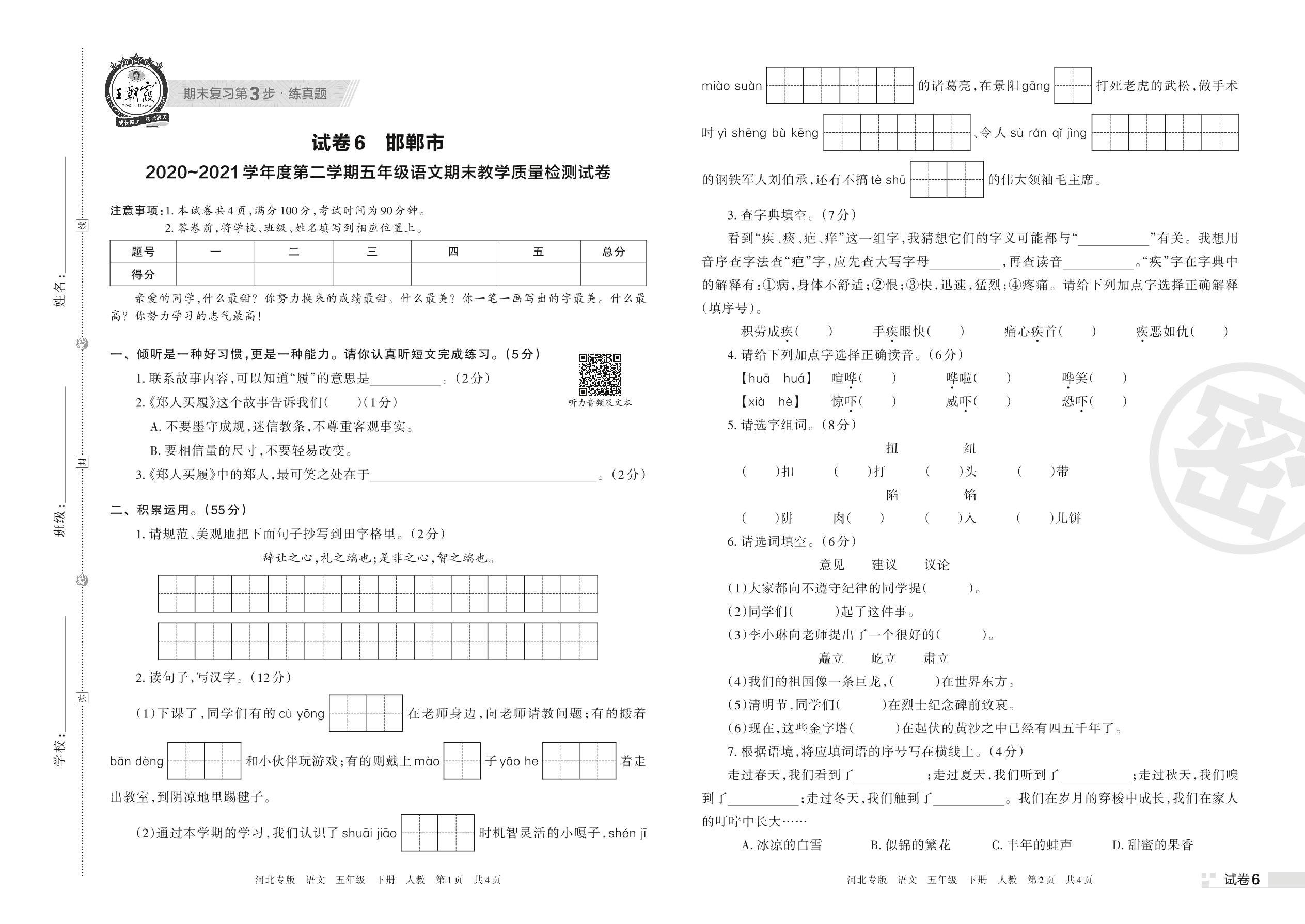 邯郸市2020~2021学年度第二学期五年级语文期末教学质量检测试卷(人教版)【6】
