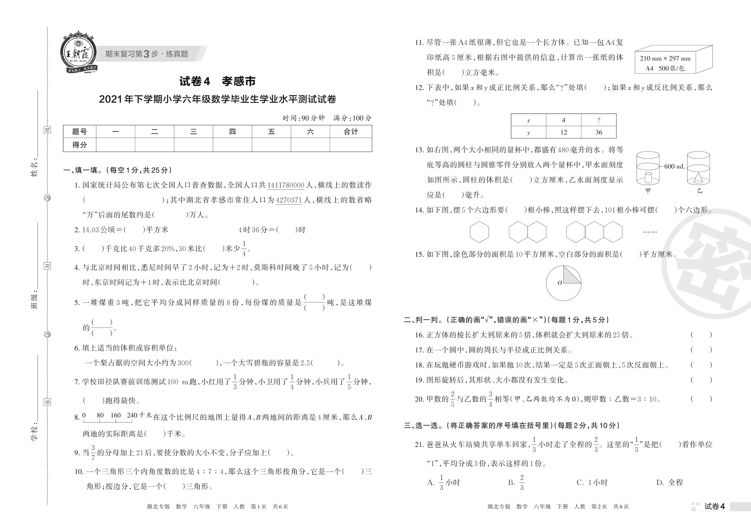 孝感市2021年下学期小学六年级数学毕业生学业水平测试试卷(人教版)【4】