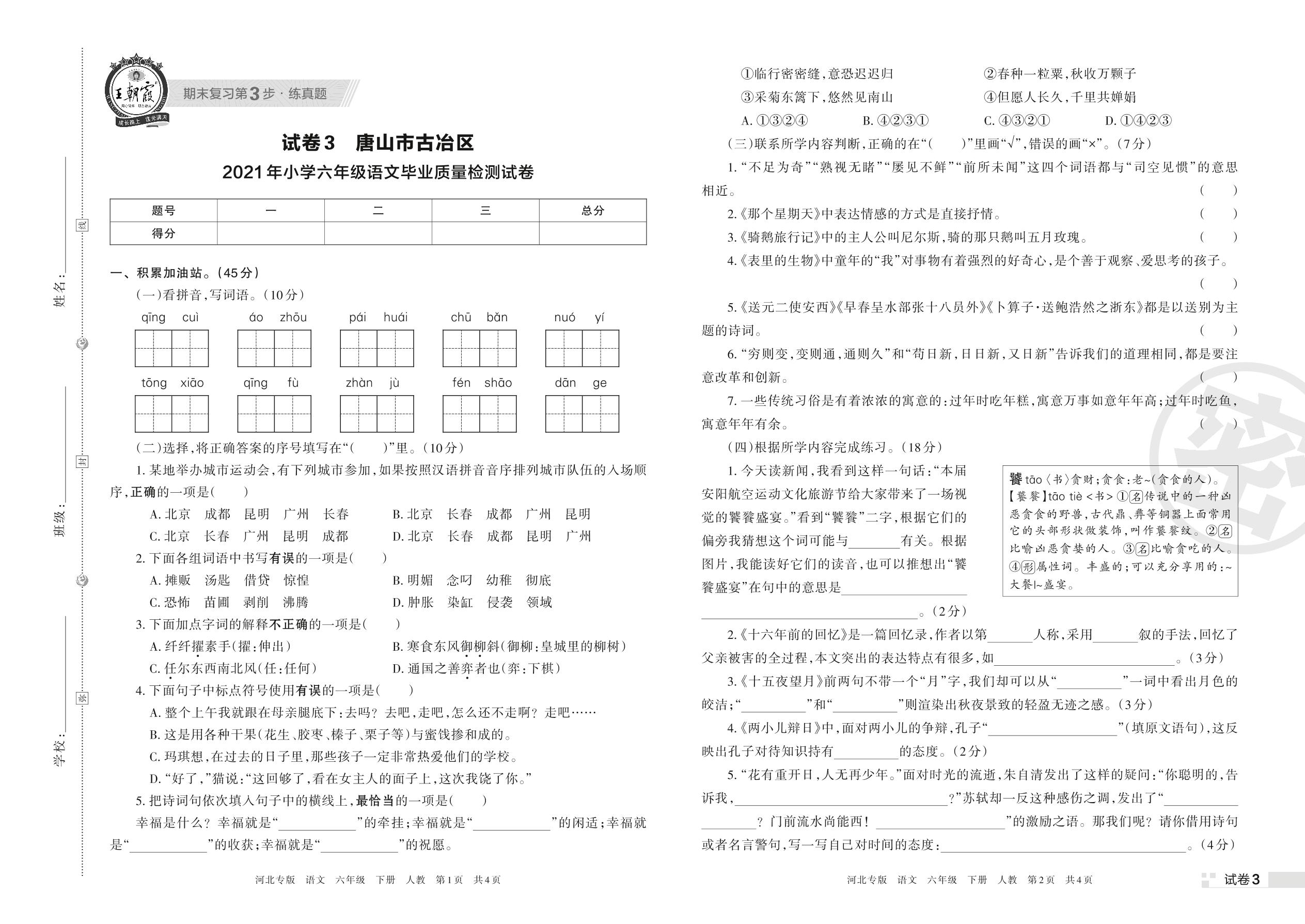 唐山市古冶区2021年小学六年级语文毕业质量检测试卷(人教版)【3】