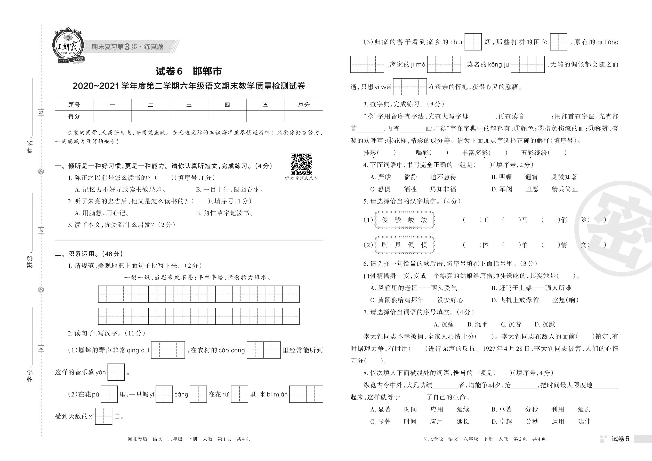 邯郸市2020~2021学年度第二学期六年级语文期末教学质量检测试卷(人教版)【6】