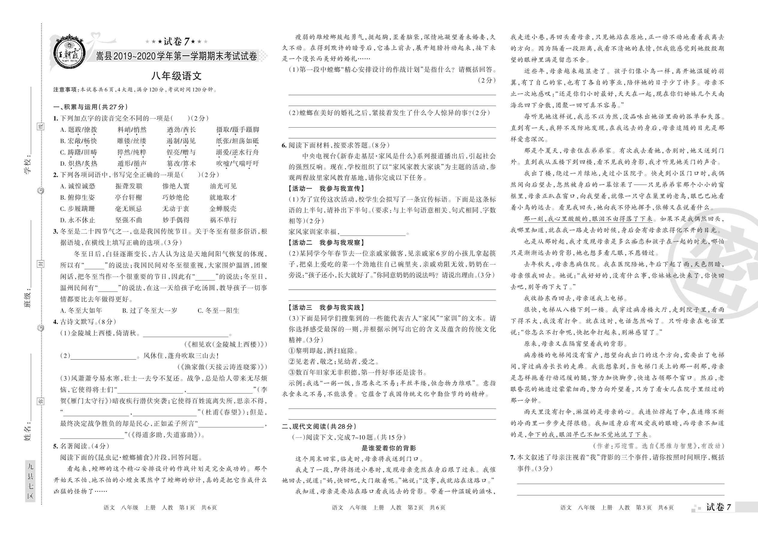 2019-2020学年第一学期洛阳市嵩县八年级语文试卷(人教版)【7】