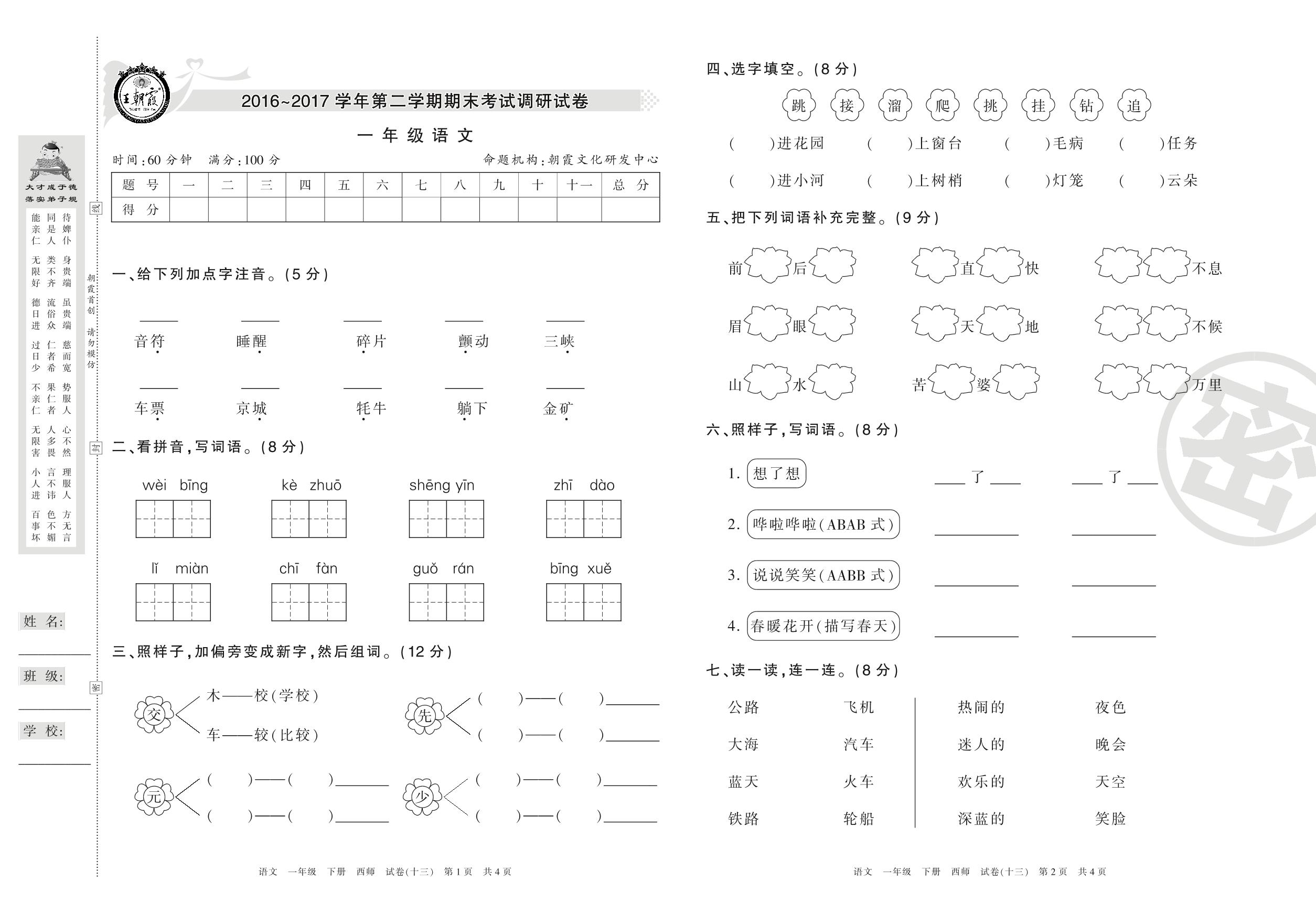 王朝霞期末调研卷一年级下册语文(西师版)【13】