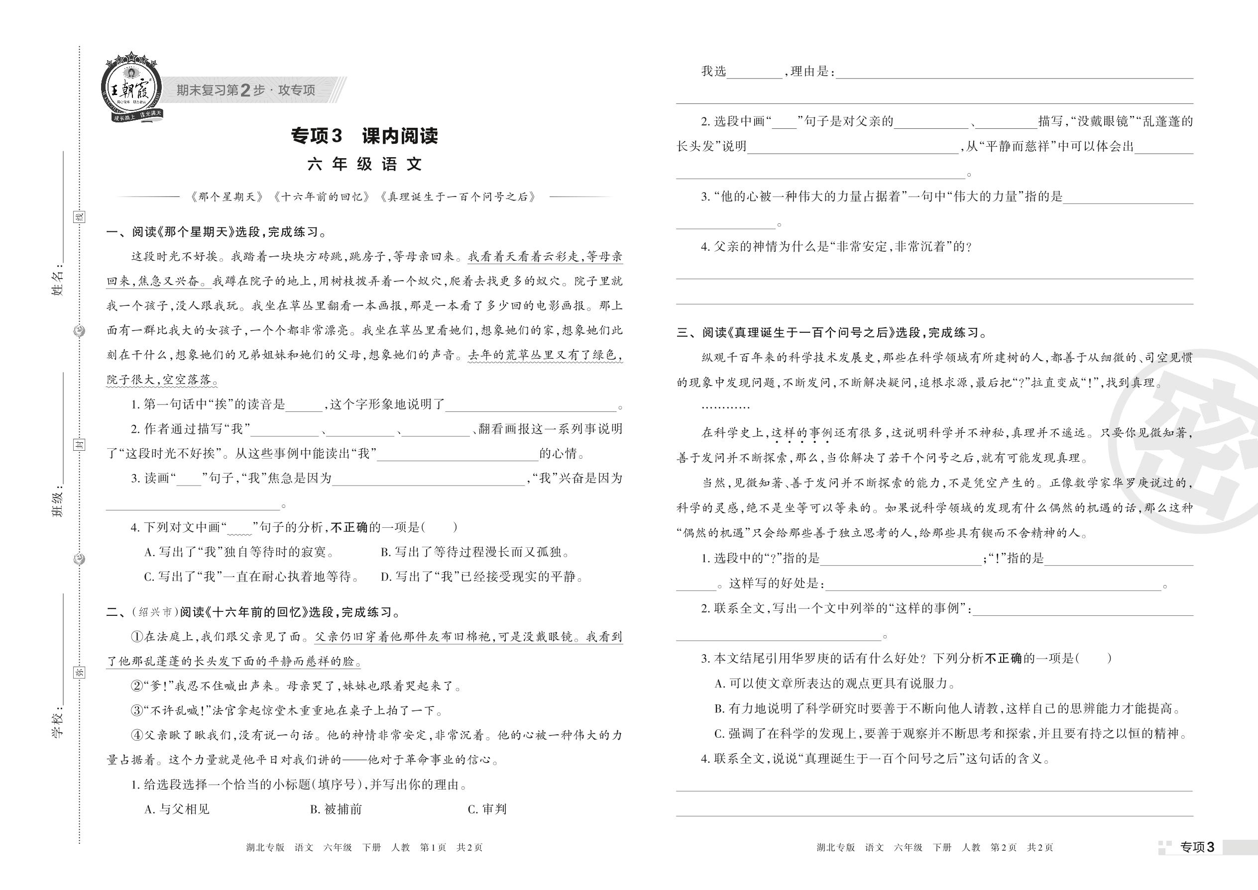 王朝霞期末专项卷——课内阅读六年级下册语文(人教版)_R220329105615182【3】