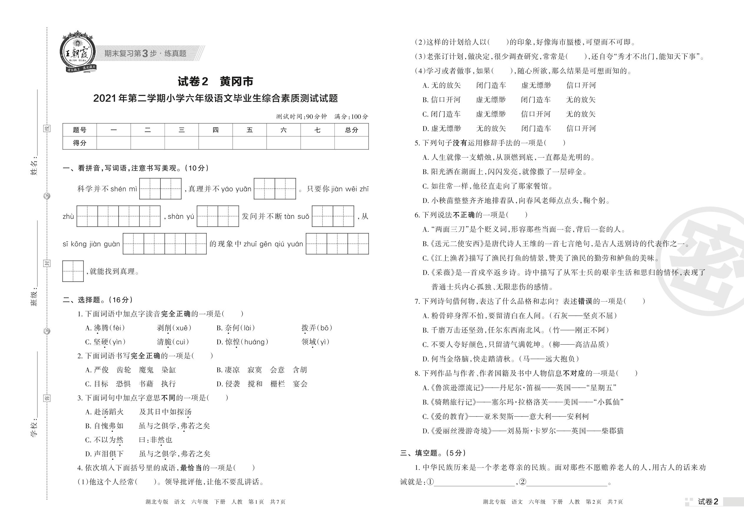 黄冈市2021年第二学期小学六年级语文毕业生综合素质测试试题(人教版)【2】