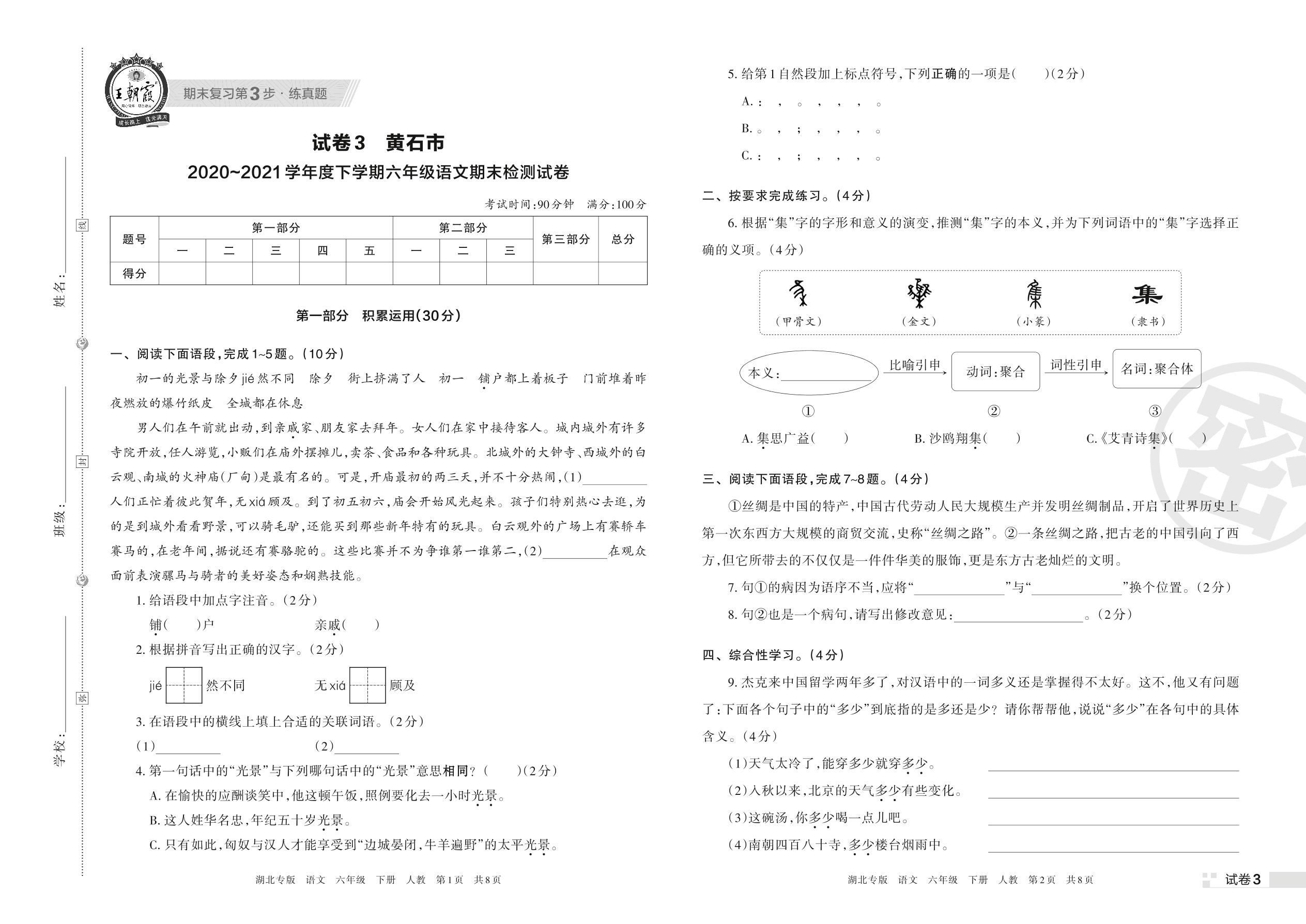 黄石市2020~2021学年度下学期六年级语文期末检测试卷(人教版)【3】