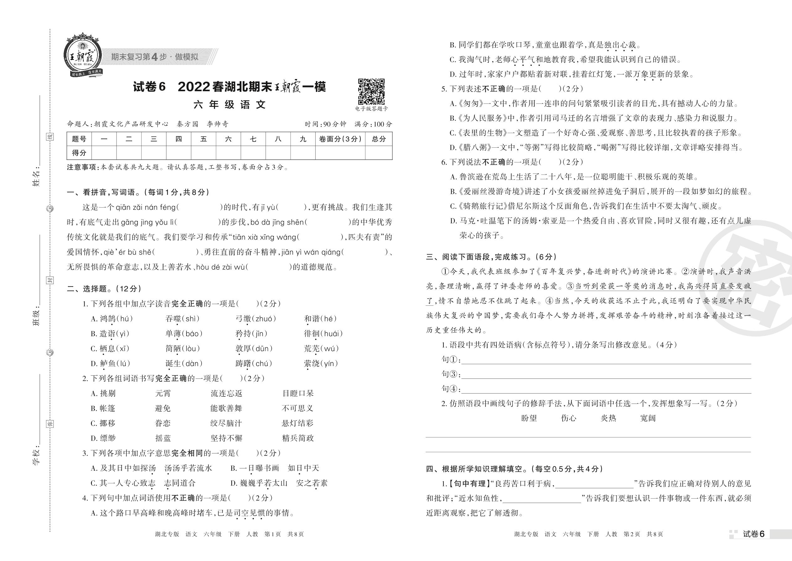 王朝霞期末模拟卷六年级下册语文(人教版)_R220329105616486【6】