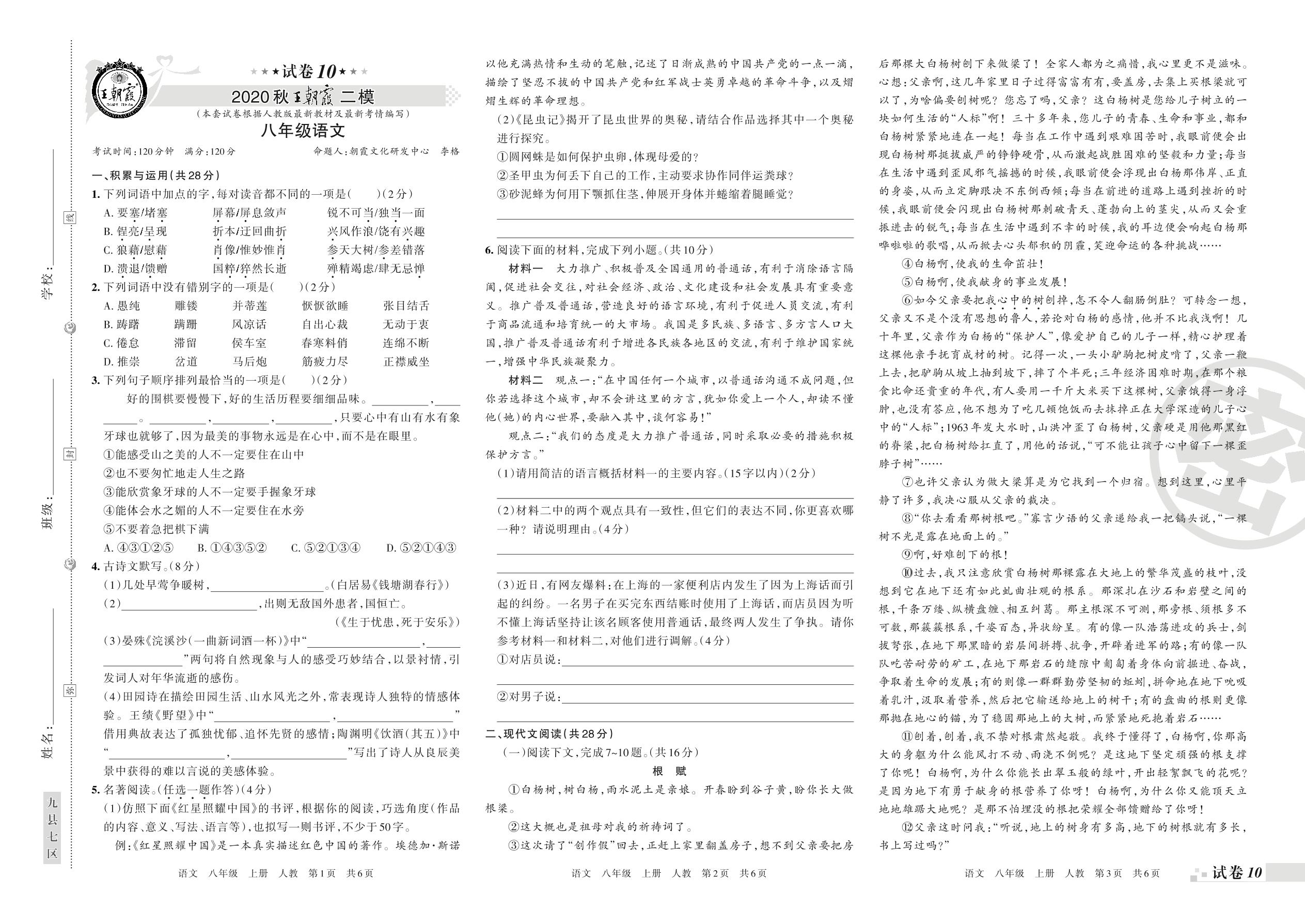 王朝霞期末模拟卷八年级上册语文(人教版)【10】