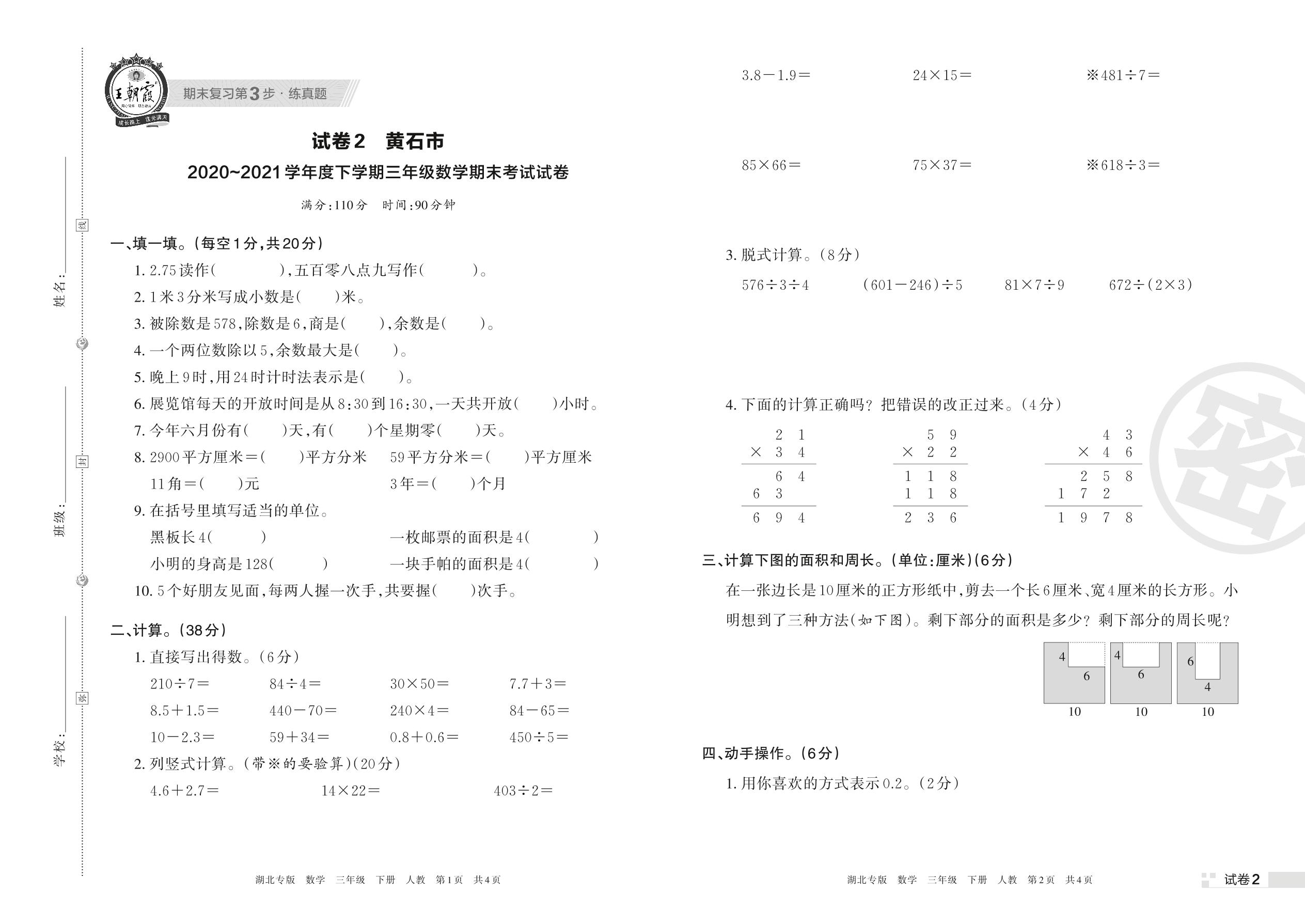 黄石市2020~2021学年度下学期三年级数学期末考试试卷(人教版)【2】