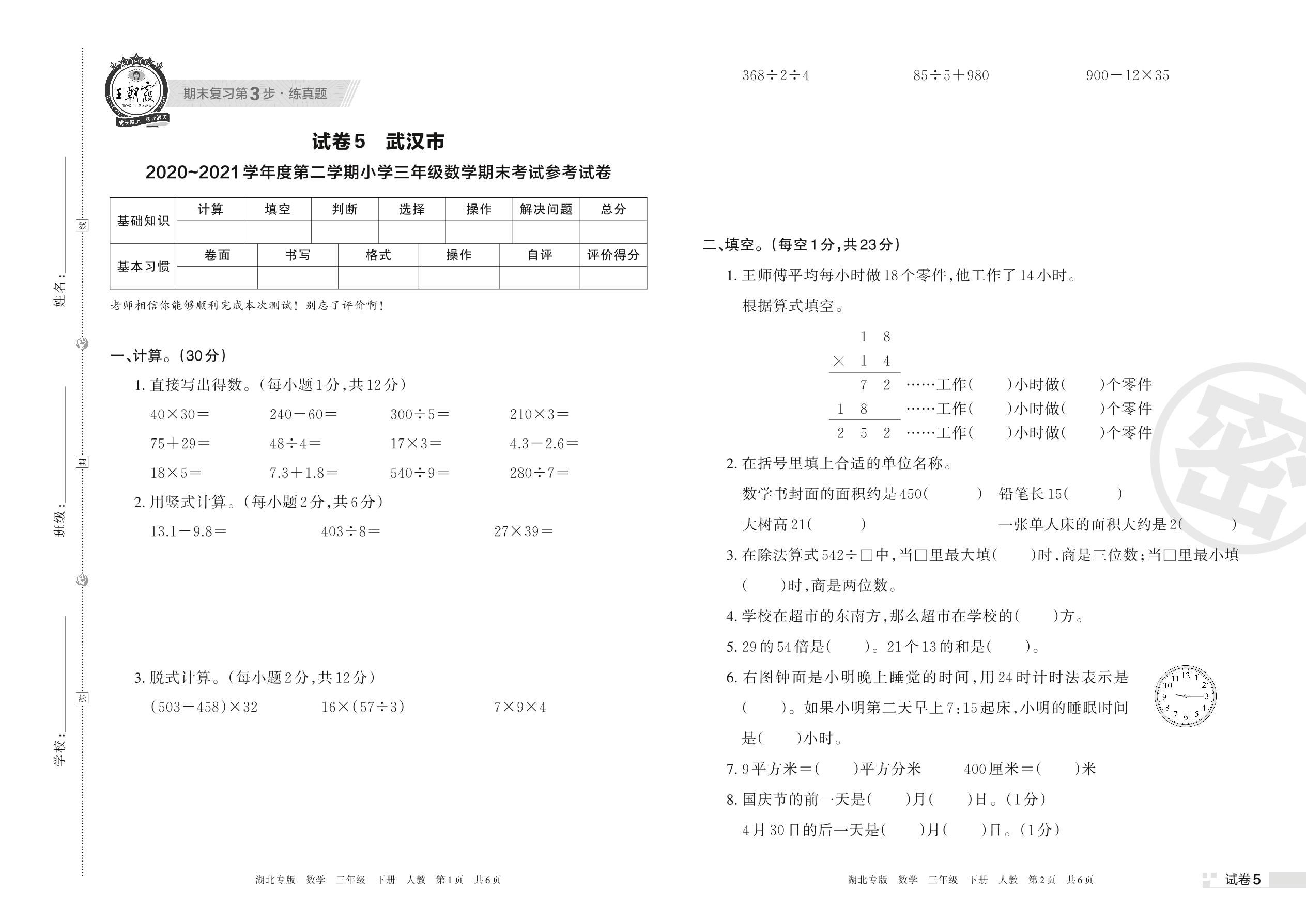 武汉市2020~2021学年度第二学期小学三年级数学期末考试参考试卷(人教版)【5】