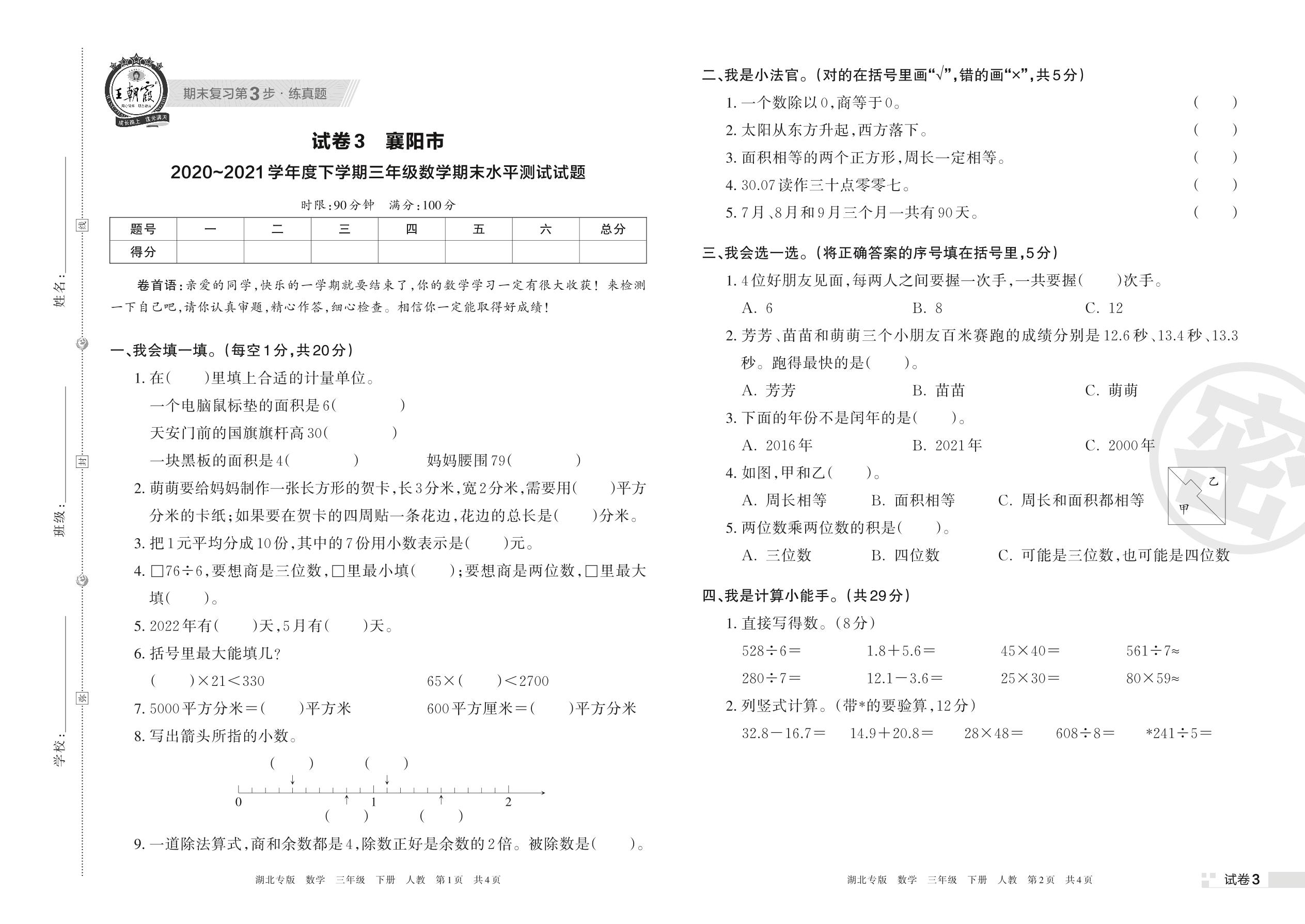 襄阳市2020~2021学年度下学期三年级数学期末水平测试试题(人教版)【3】