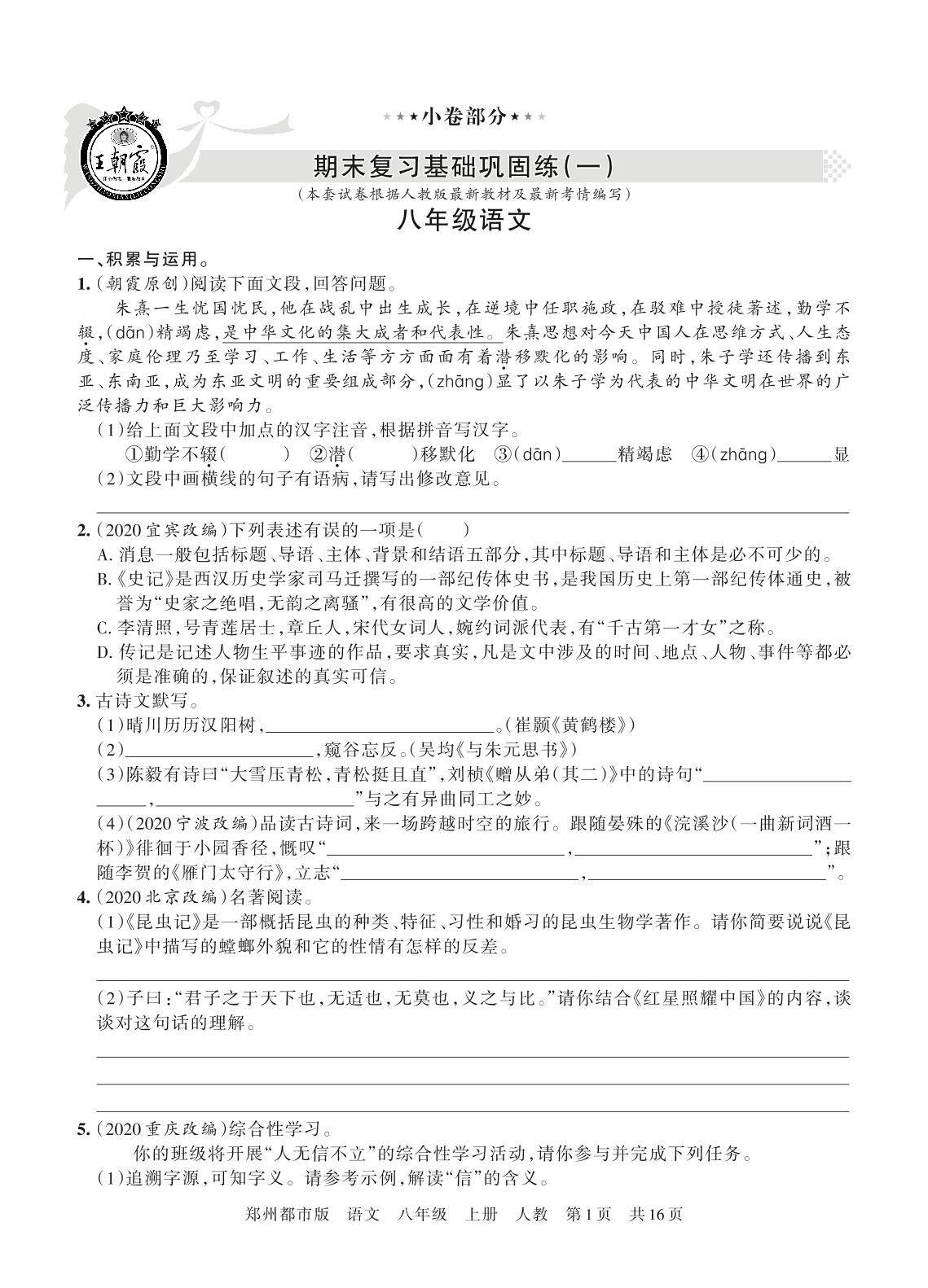王朝霞期末小卷八年级上册语文(人教版)_R21080214624【0】
