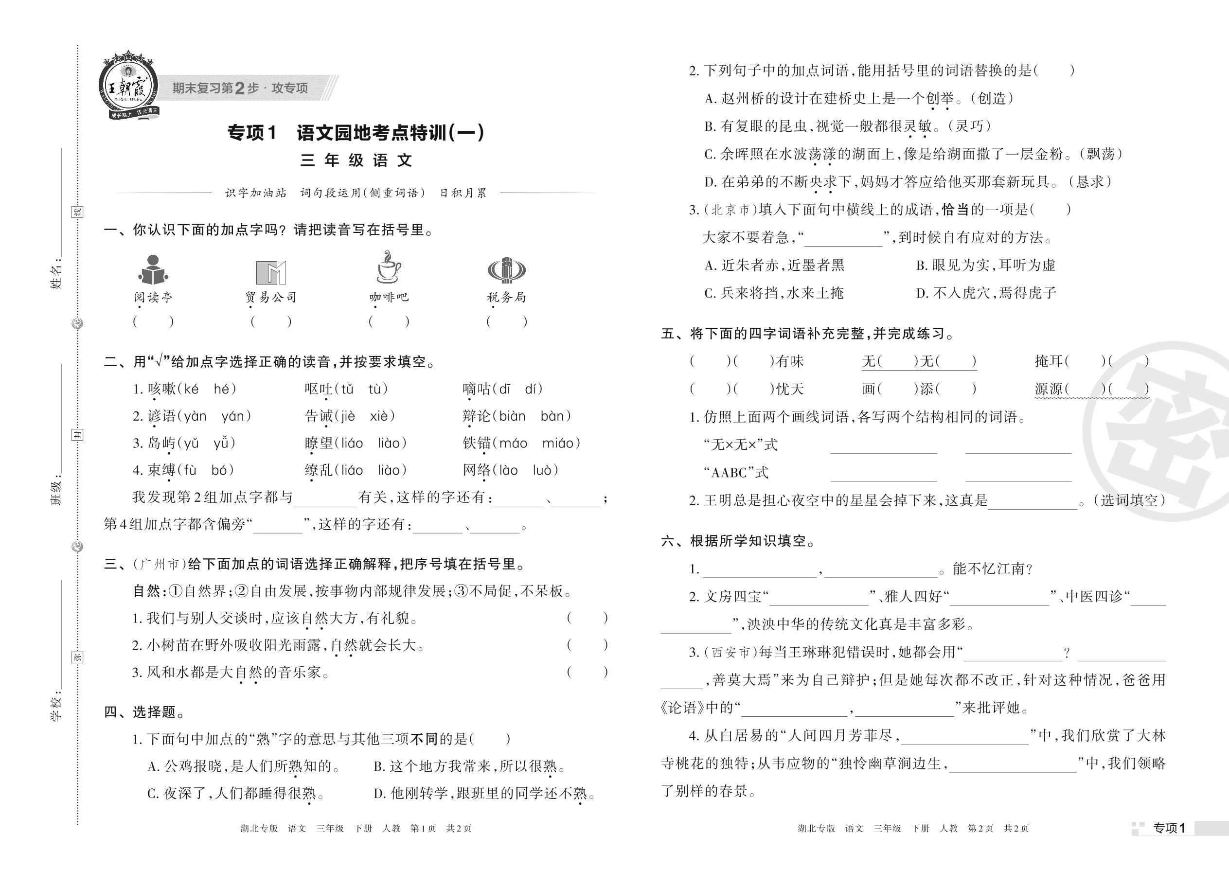 王朝霞期末专项卷——语文园地考点特训(一)三年级下册语文(人教版)_R220329114716297【1】