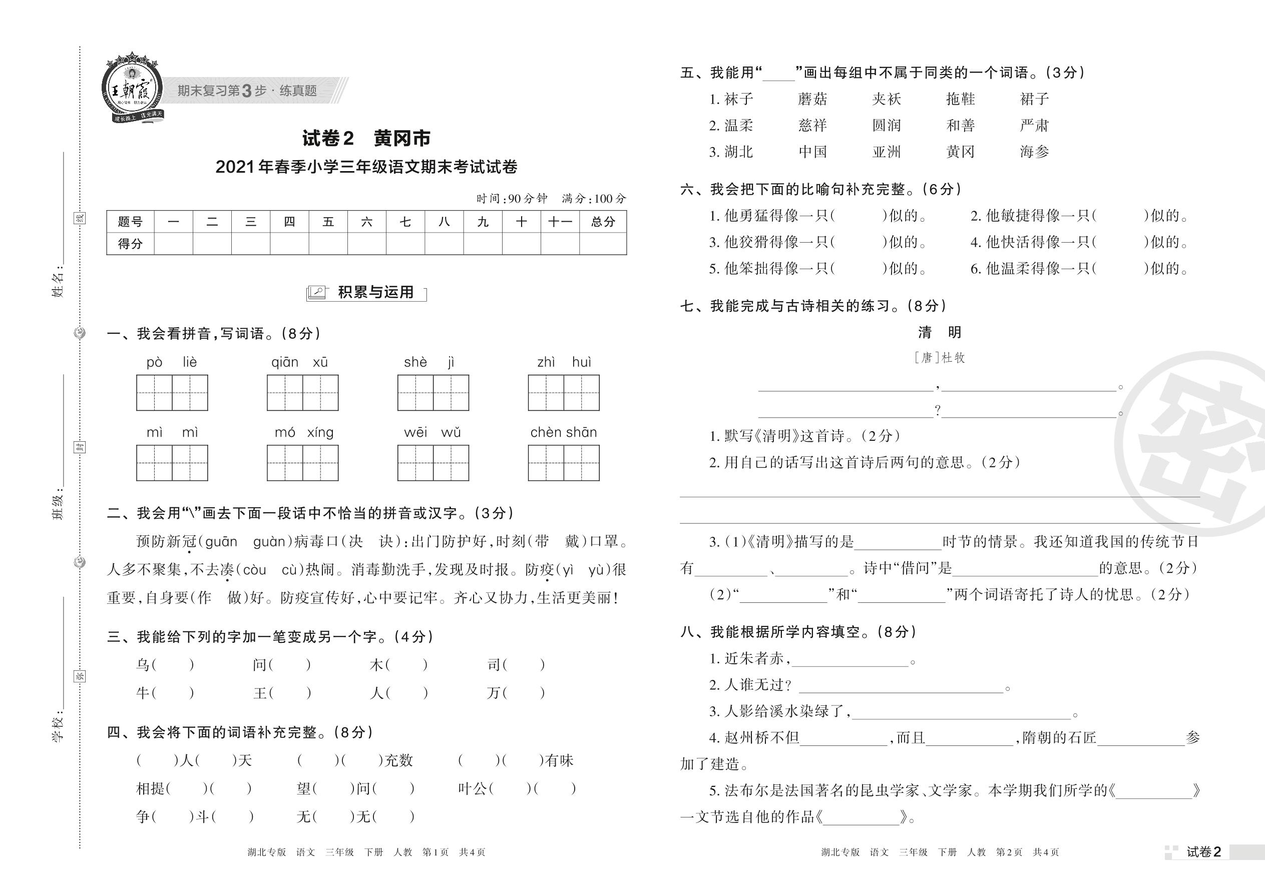 黄冈市2021年春季小学三年级语文期末考试试卷(人教版)【2】
