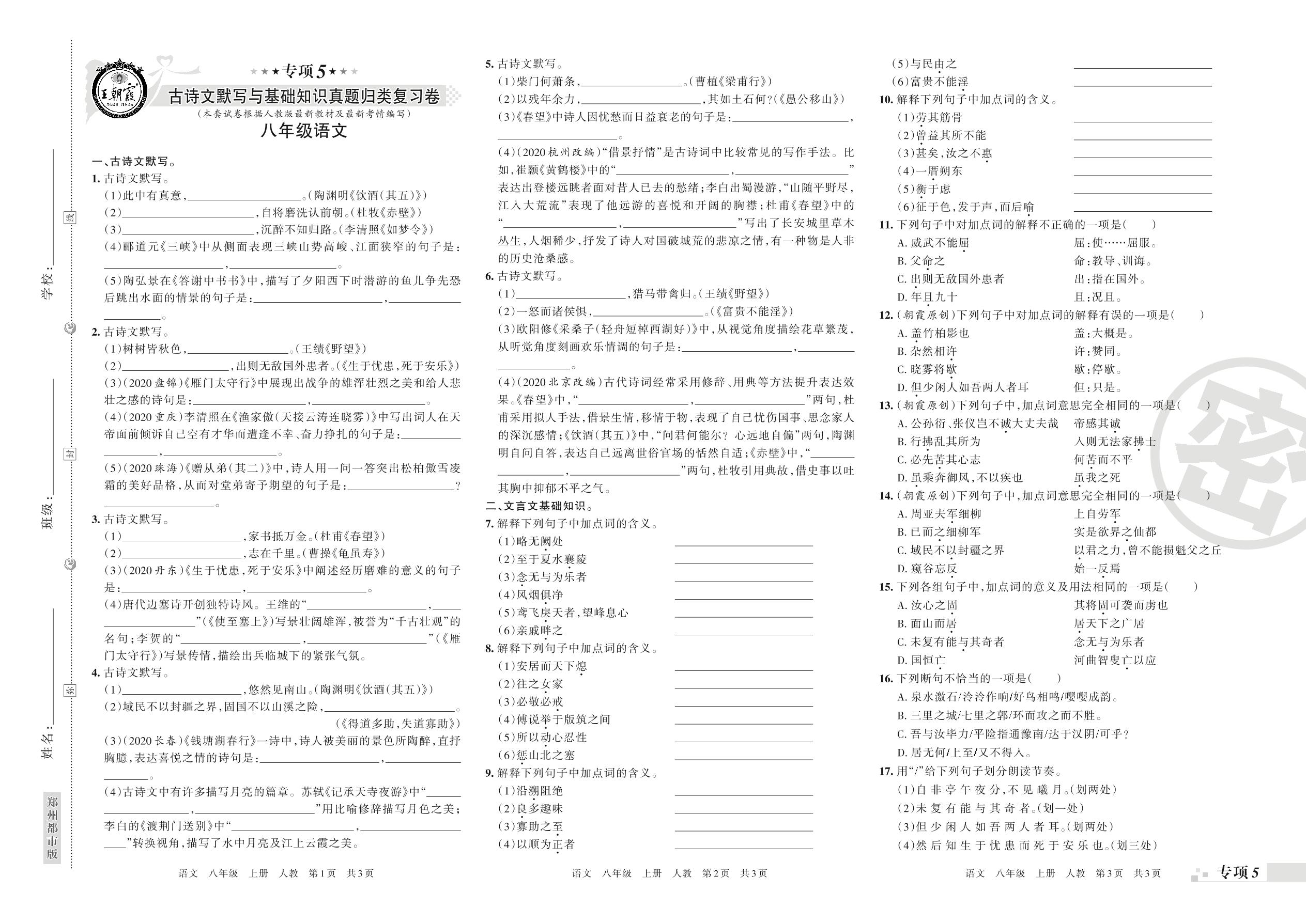 王朝霞期末专项卷——古诗文默写与基础知识、课内文言文阅读八年级上册语文(人教版)_R21080214654【0】