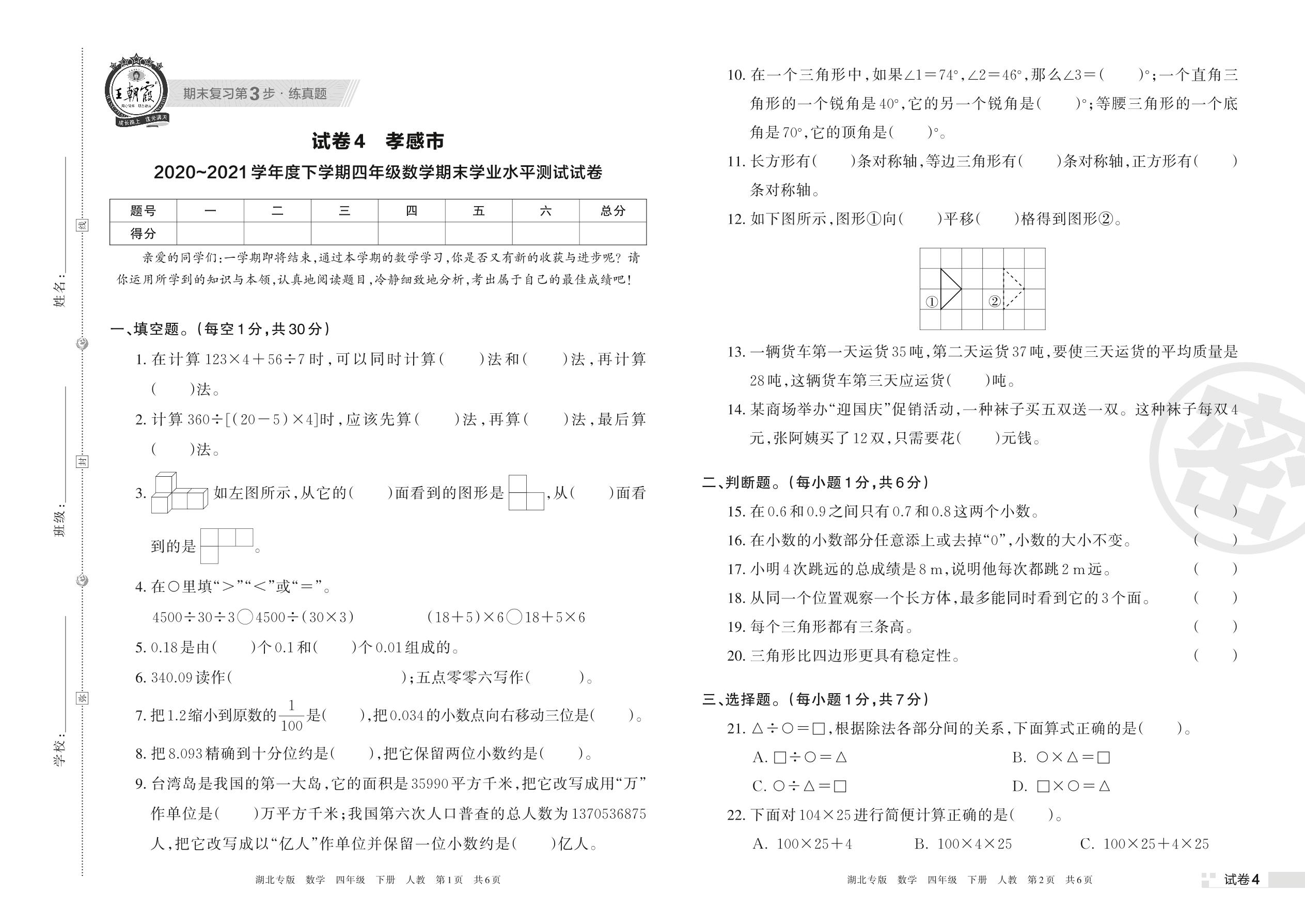 孝感市2020~2021学年度下学期四年级数学期末学业水平测试试卷(人教版)【4】