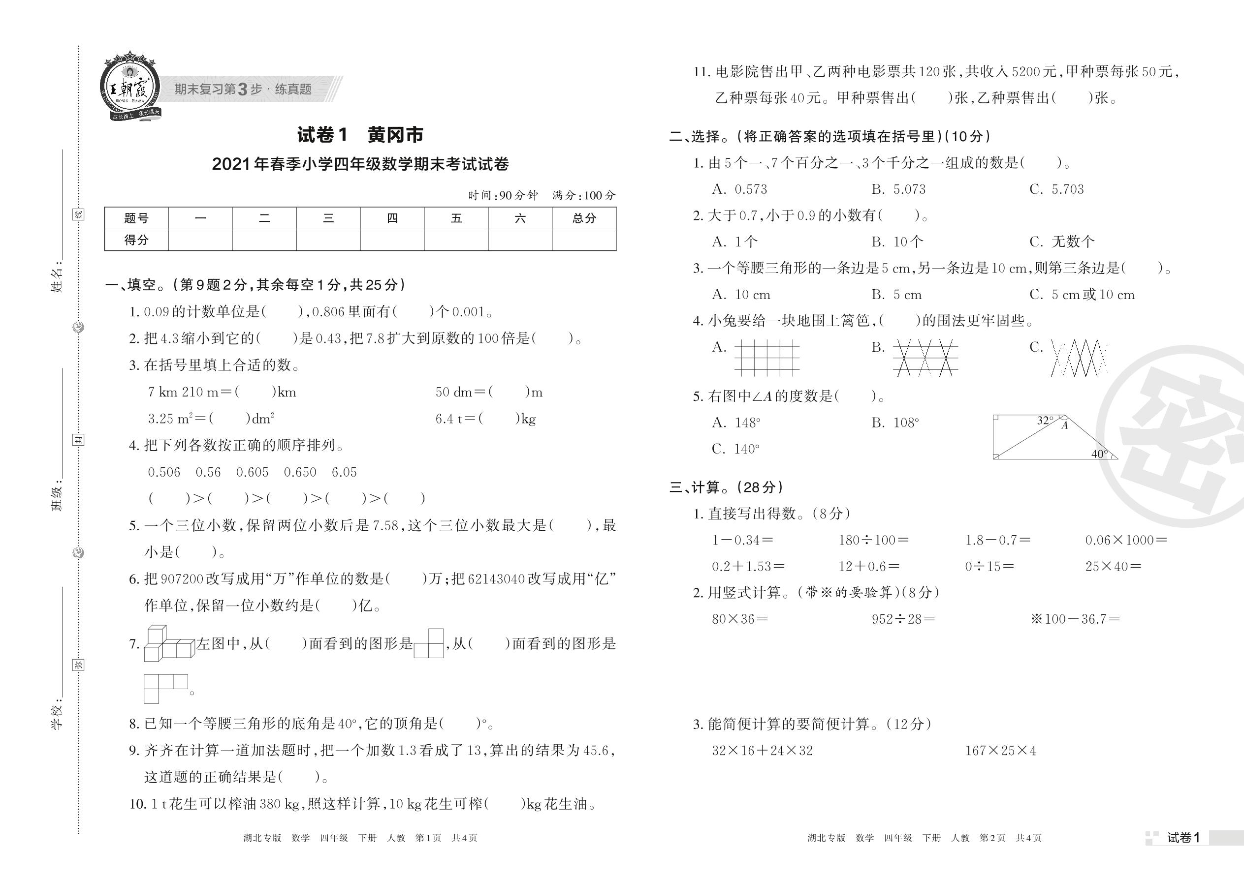 黄冈市2021年春季小学四年级数学期末考试试卷(人教版)【1】