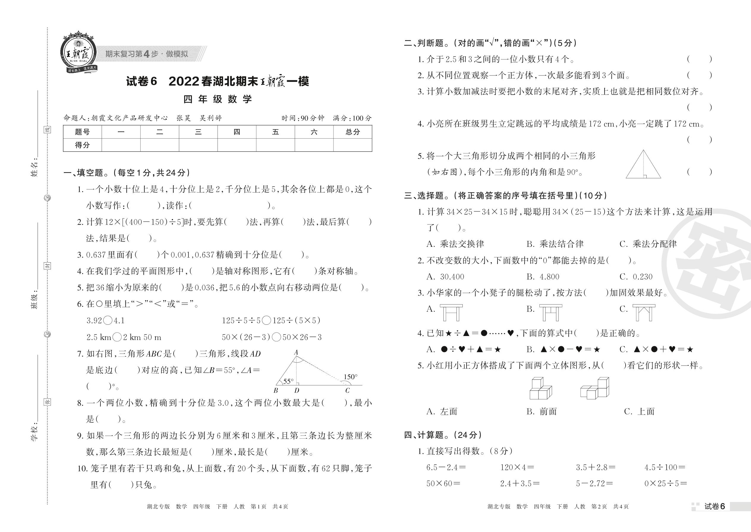 王朝霞期末模拟卷四年级下册数学(人教版)_R220329115644497【6】