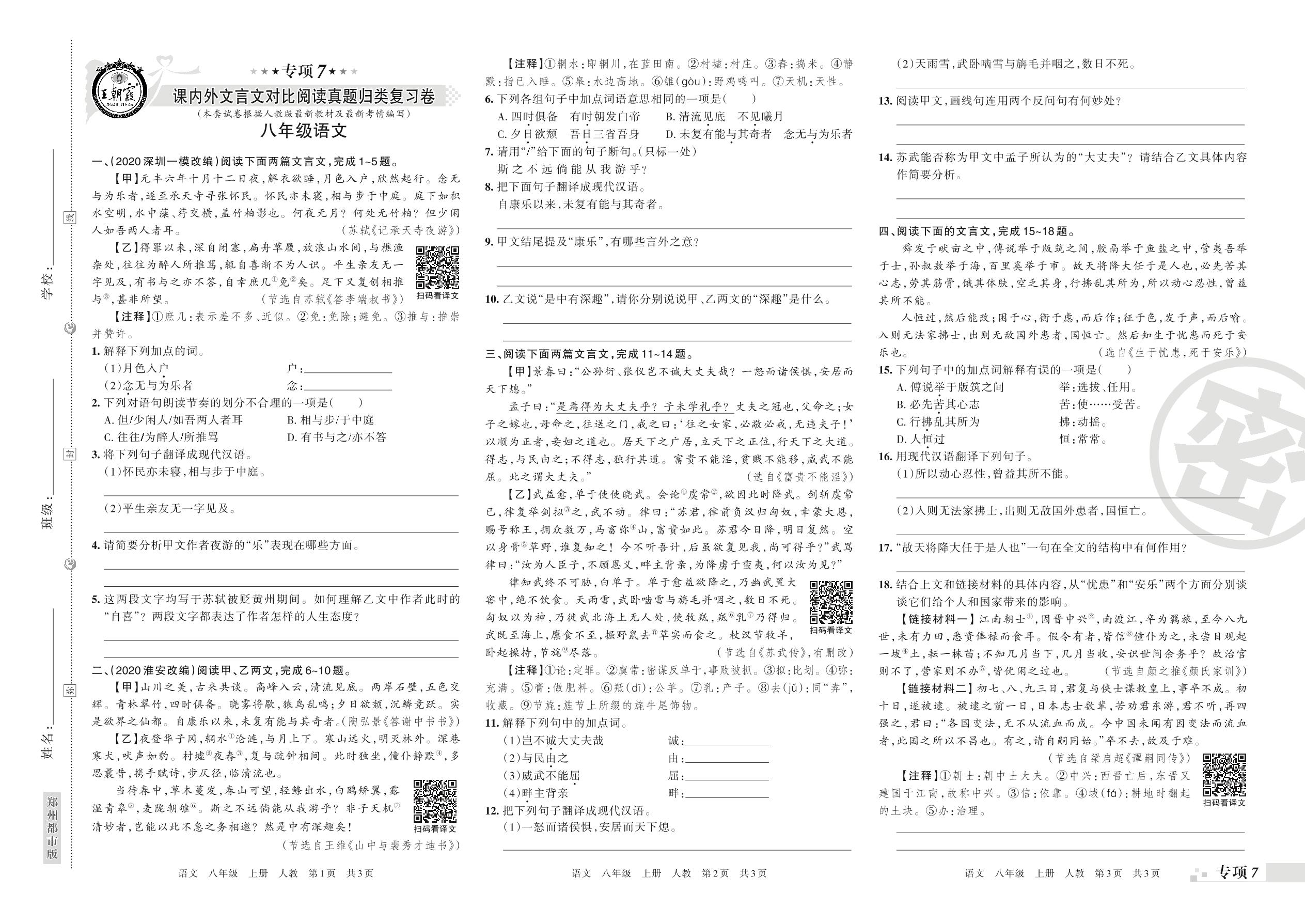 王朝霞期末专项——课内外文言文对比阅读、古诗词阅读真题归类复习八年级上册语文(人教版)_R21080214702【0】