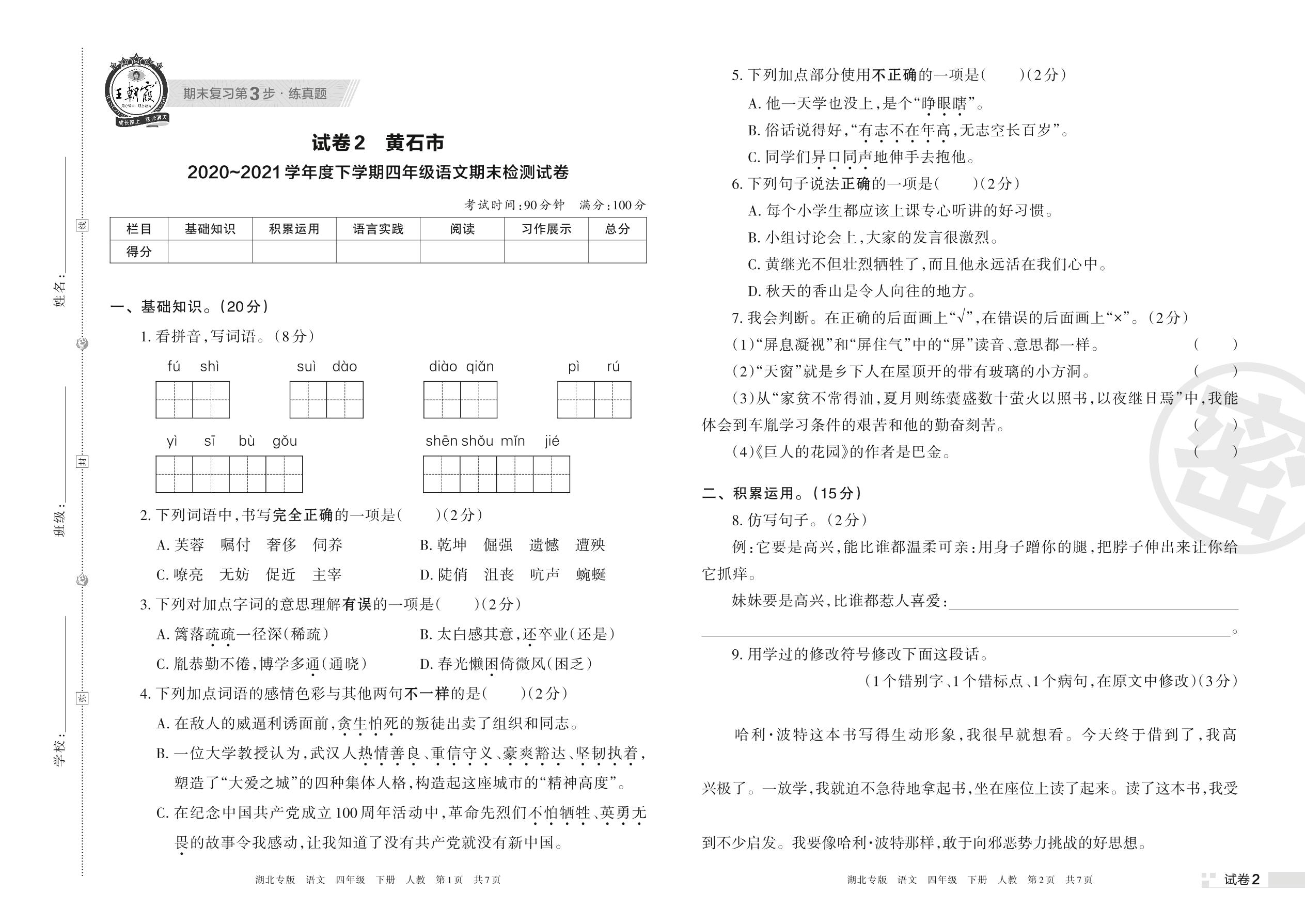 黄石市2020~2021学年度下学期四年级语文期末检测试卷(人教版)【2】