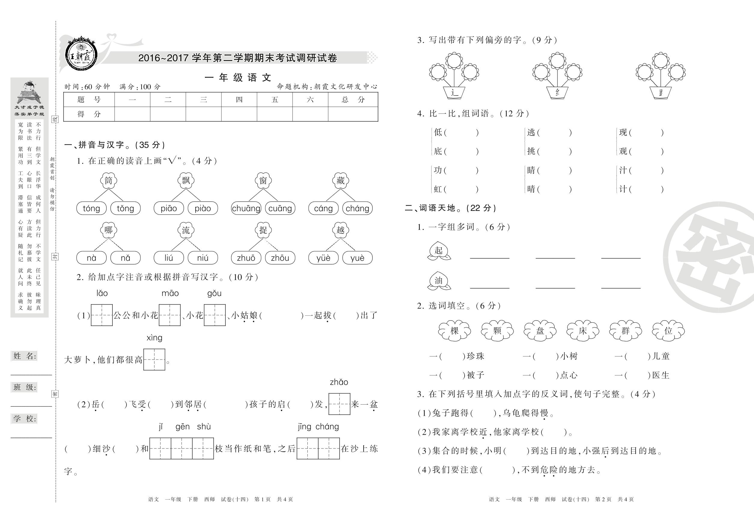 王朝霞期末调研卷一年级下册语文(西师版)【14】