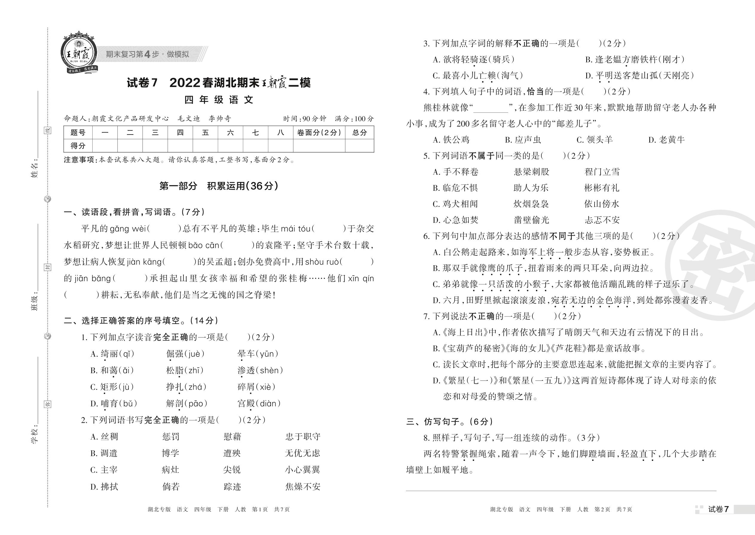王朝霞期末模拟卷四年级下册语文(人教版)_R220329133821272【7】