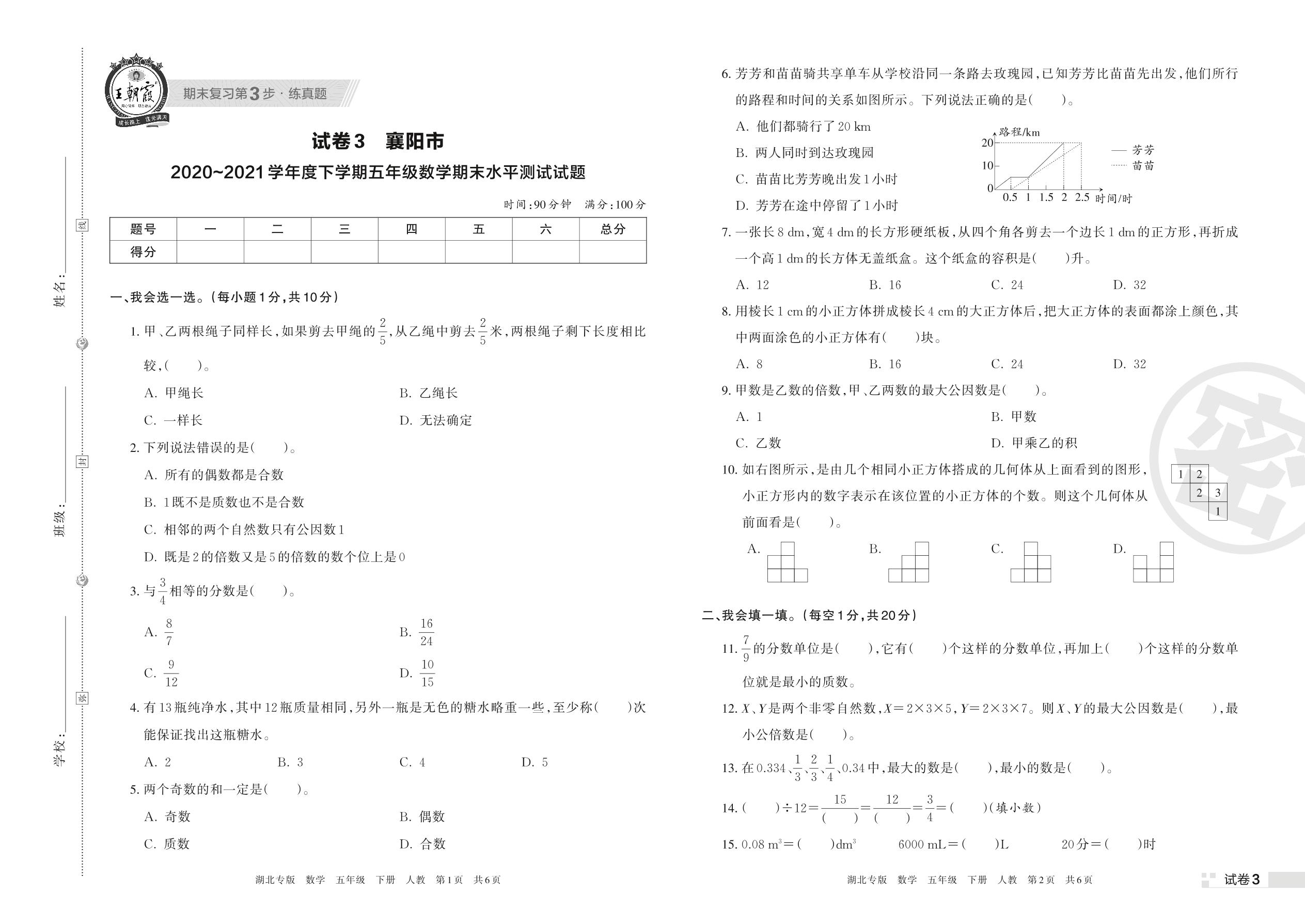 襄阳市2020~2021学年度下学期五年级数学期末水平测试试题(人教版)【3】