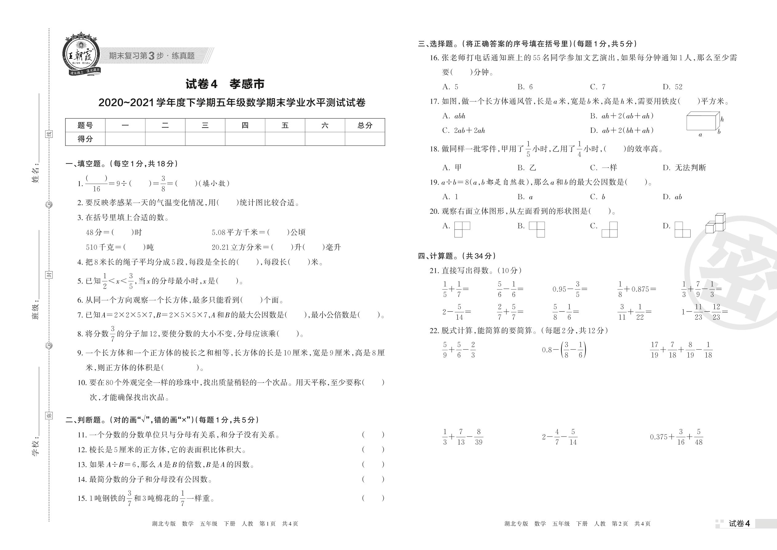 孝感市2020~2021学年度下学期五年级数学期末学业水平测试试卷(人教版)【4】