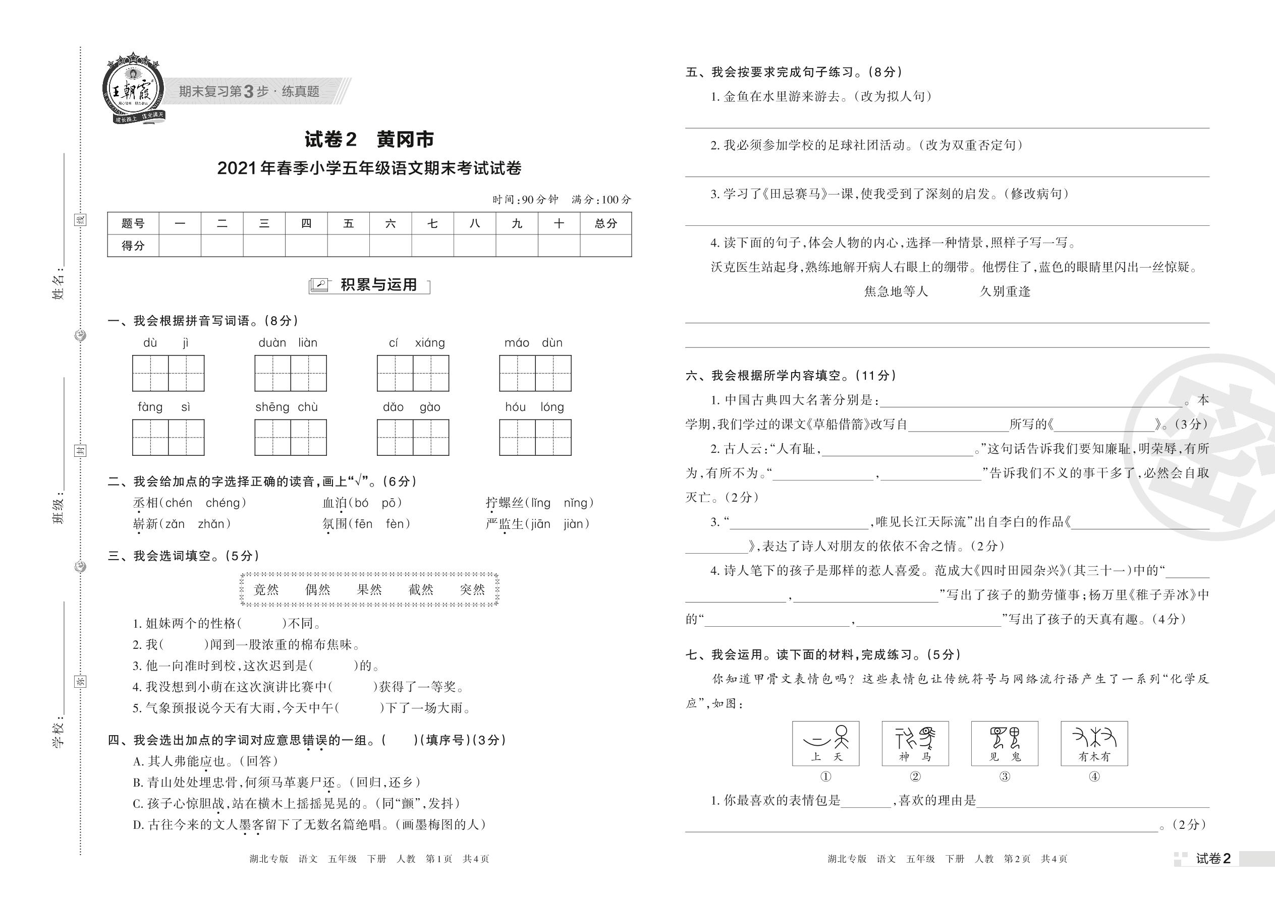 黄冈市2021年春季小学五年级语文期末考试试卷(人教版)【2】