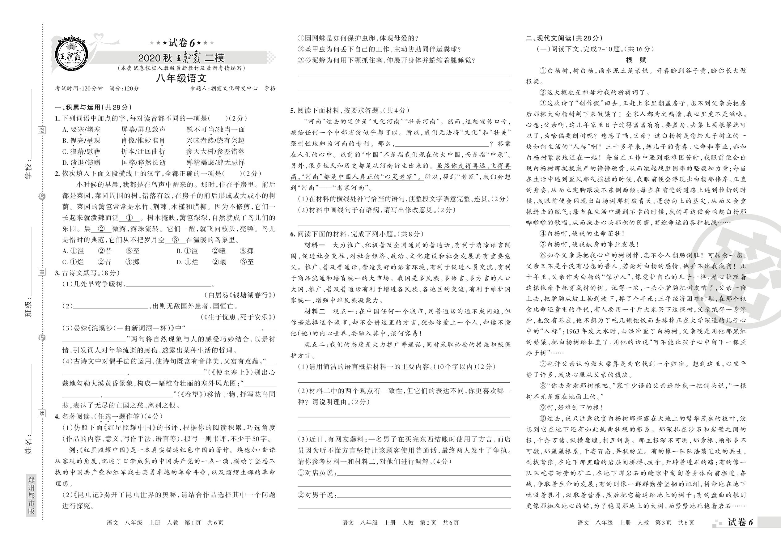 王朝霞期末模拟卷八年级上册语文(人教版)_R21080214807【6】