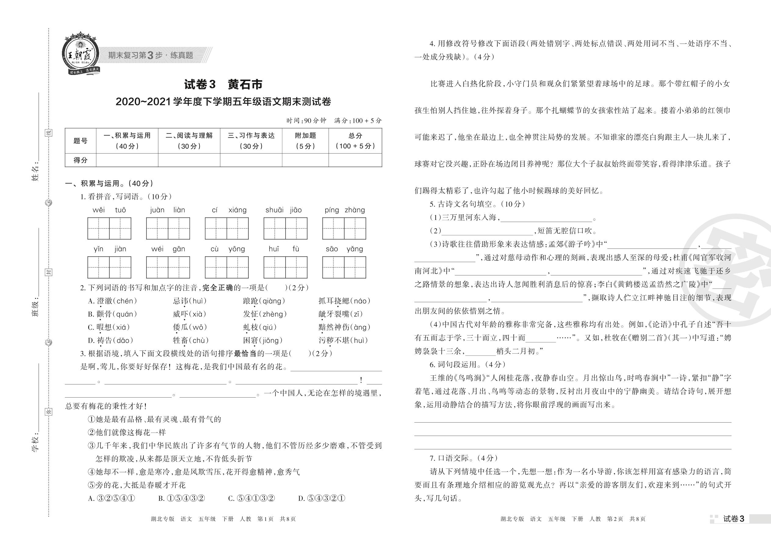 黄石市2020~2021学年度下学期五年级语文期末测试卷(人教版)【3】