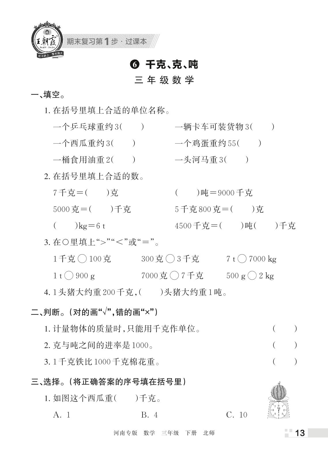 王朝霞期末过课本——6 千克、克、吨三年级下册数学(北师版)_R220329151459764