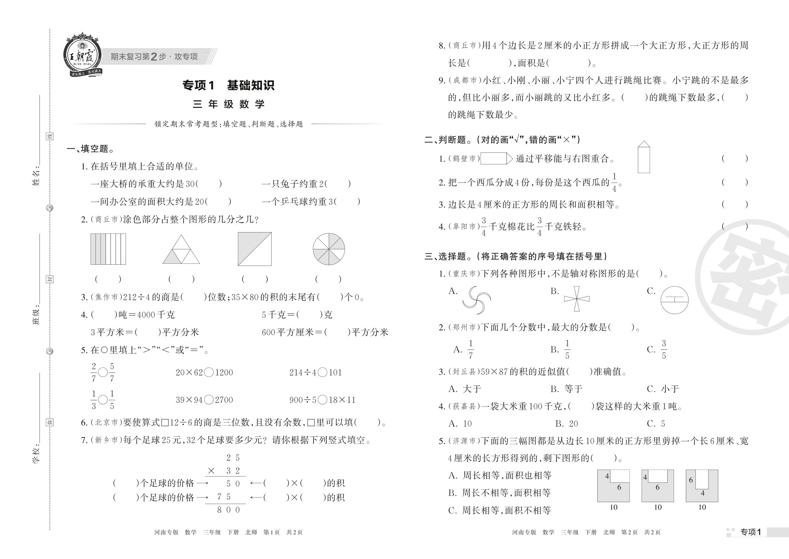 王朝霞期末专项卷——基础知识三年级下册数学(北师版)_R220329151500290【1】