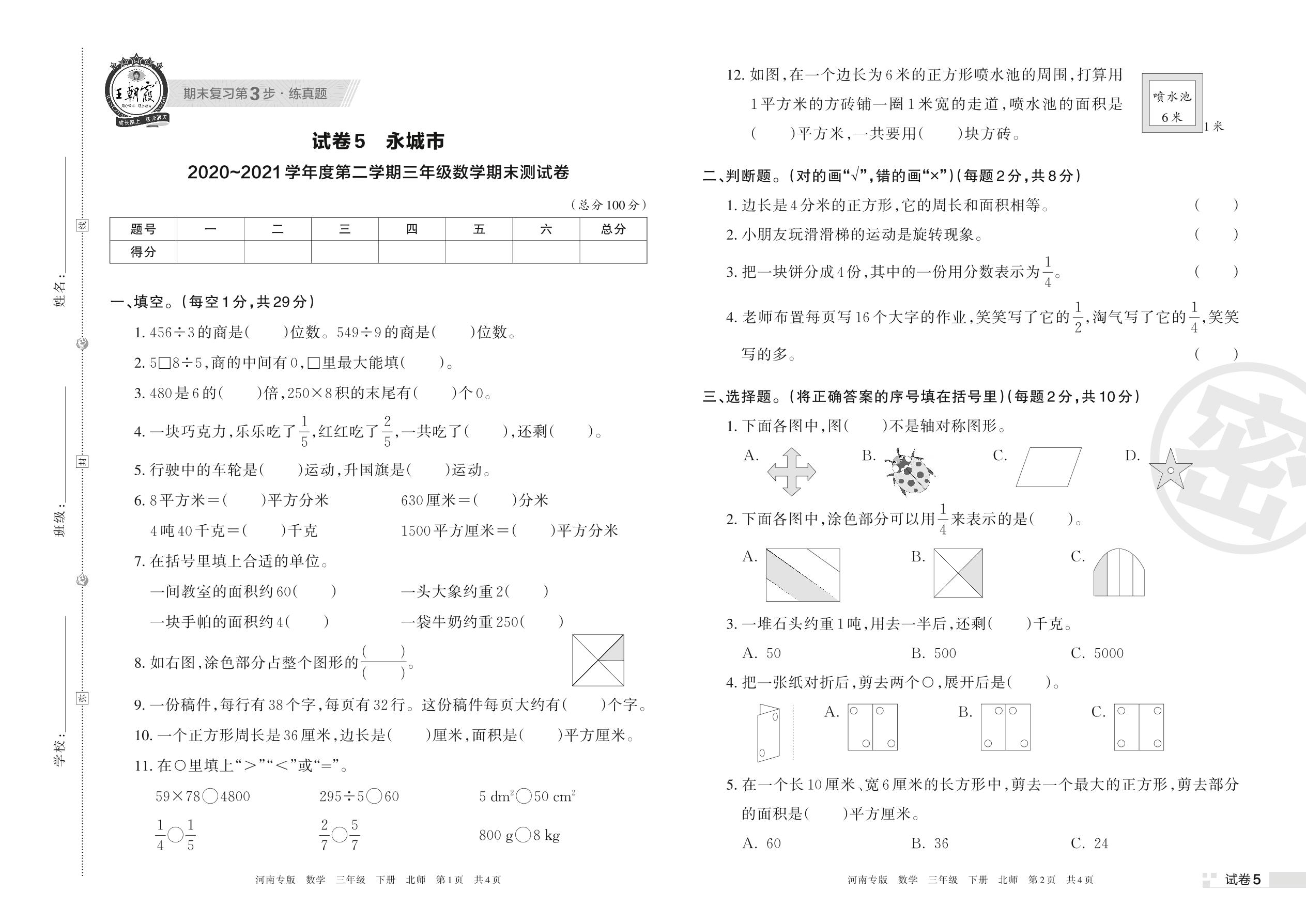 永城市2020~2021学年度第二学期三年级数学期末测试卷(北师版)【5】