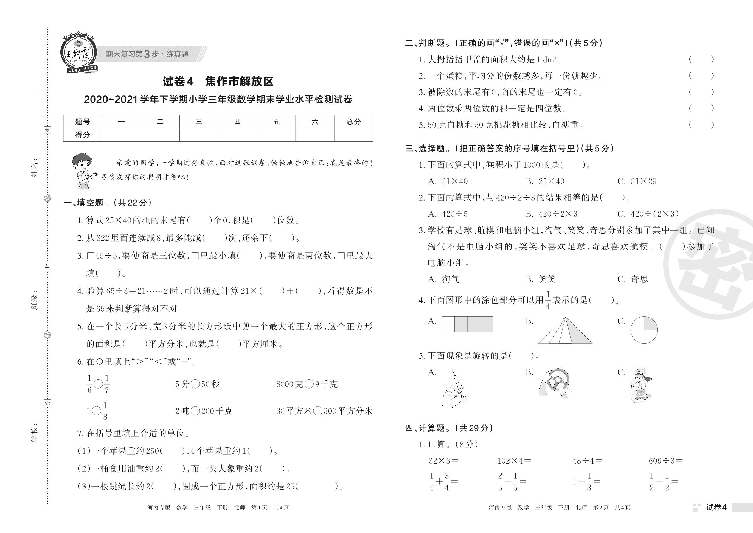 焦作市解放区2020~2021学年下学期小学三年级数学期末学业水平检测试卷(北师版)【4】