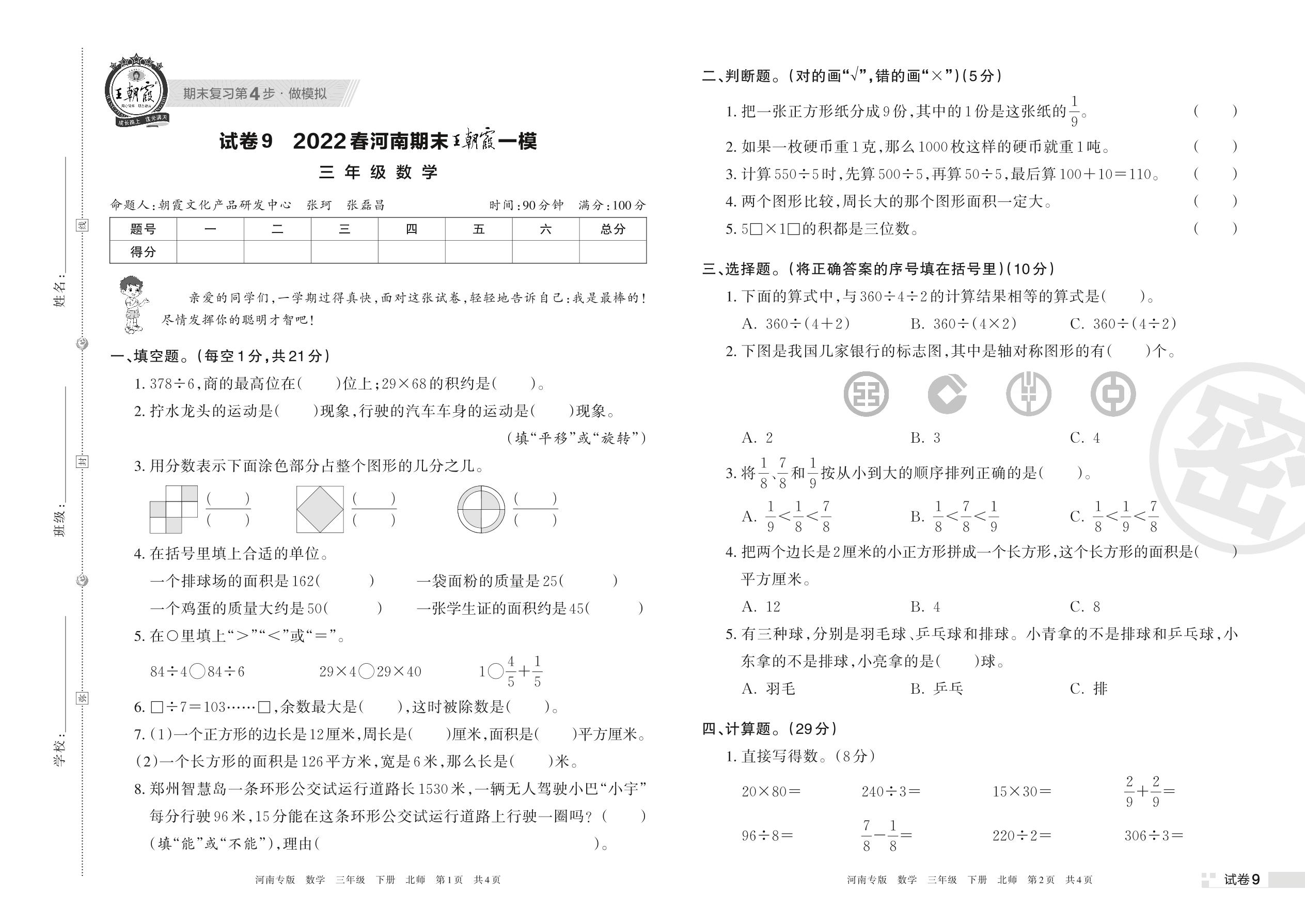王朝霞期末模拟卷三年级下册数学(北师版)【9】