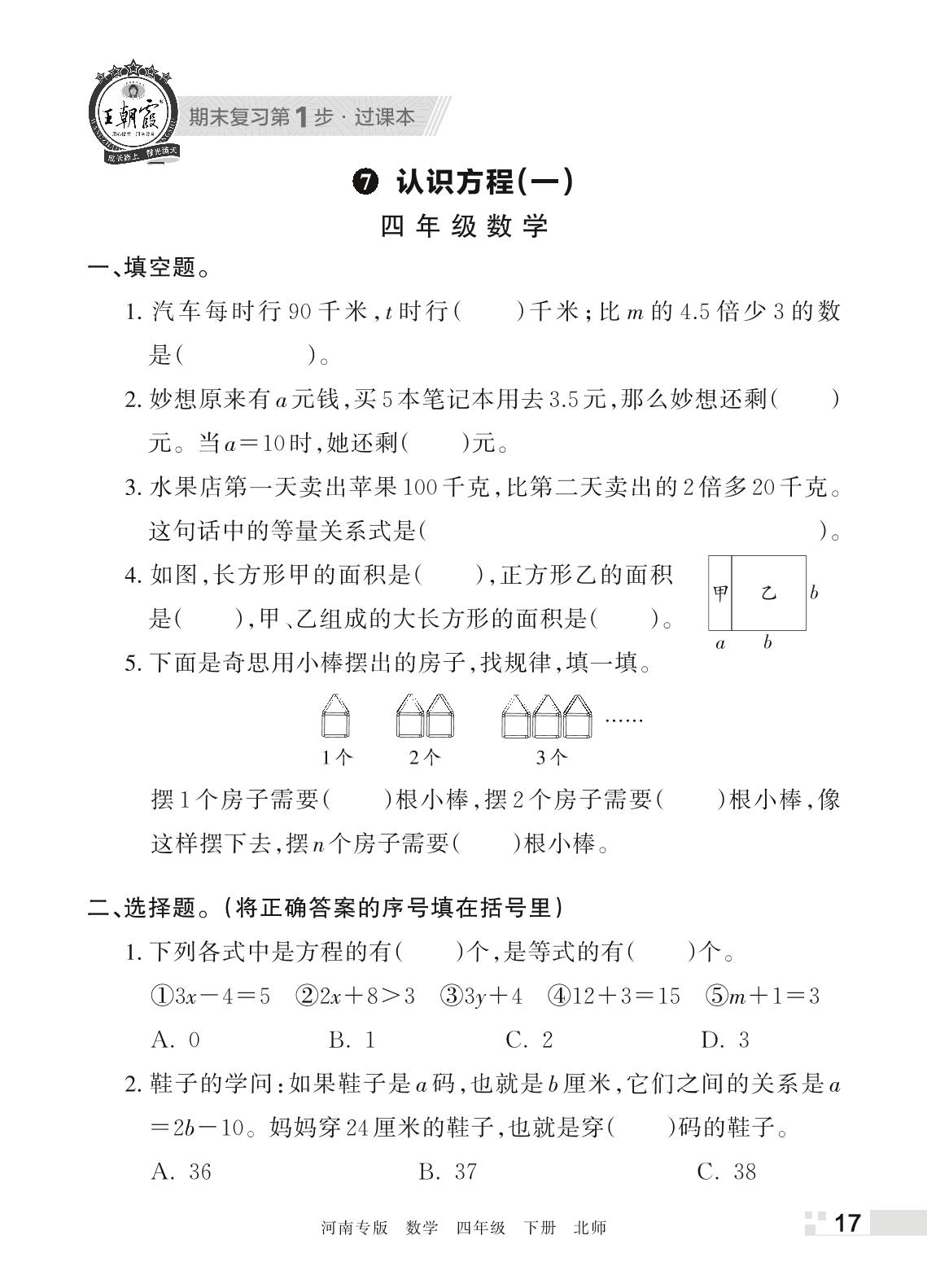 王朝霞期末过课本——7 认识方程(一)四年级下册数学(北师版)_R220329152238855