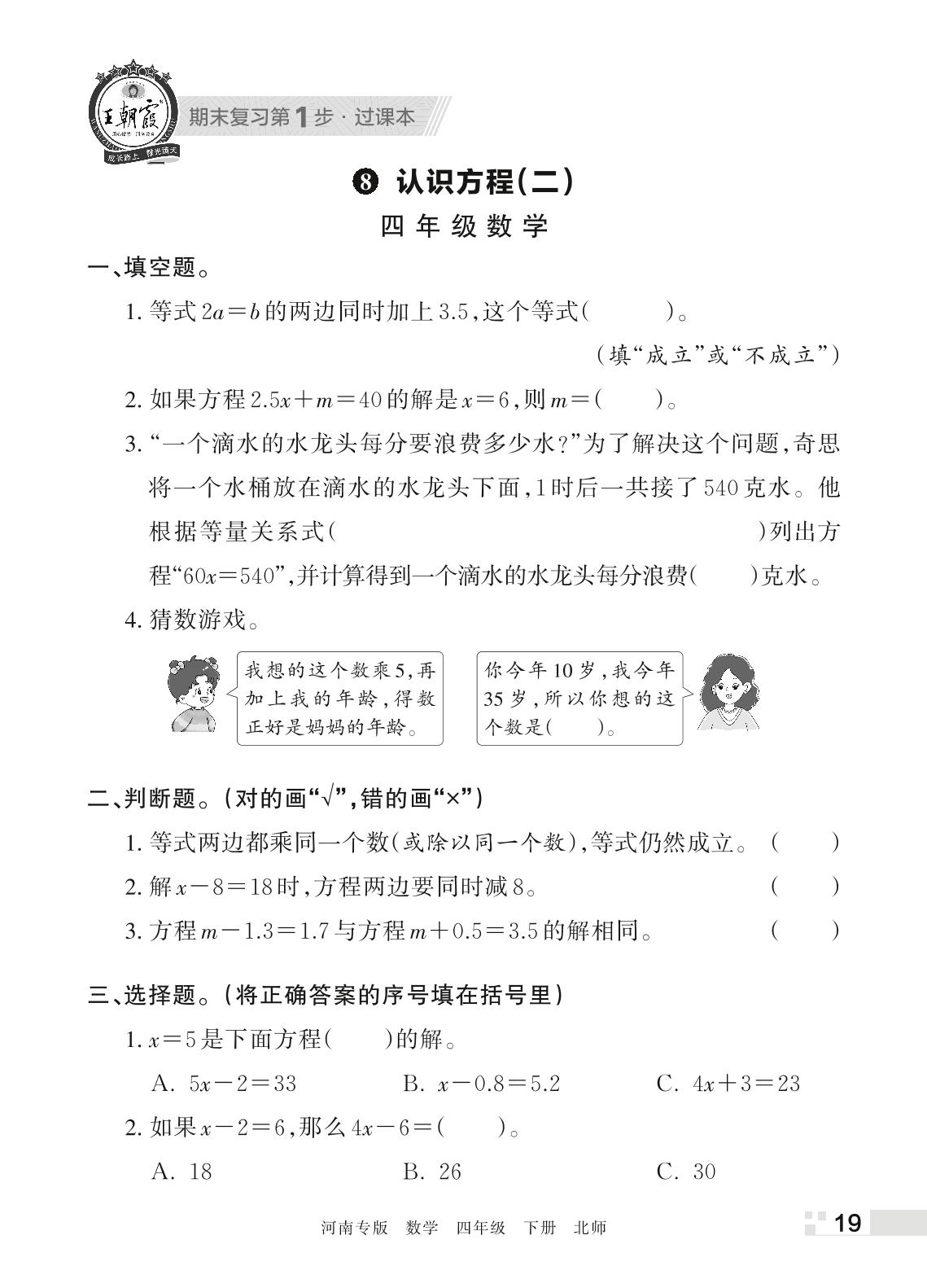 王朝霞期末过课本——8 认识方程(二)四年级下册数学(北师版)_R220329152239330