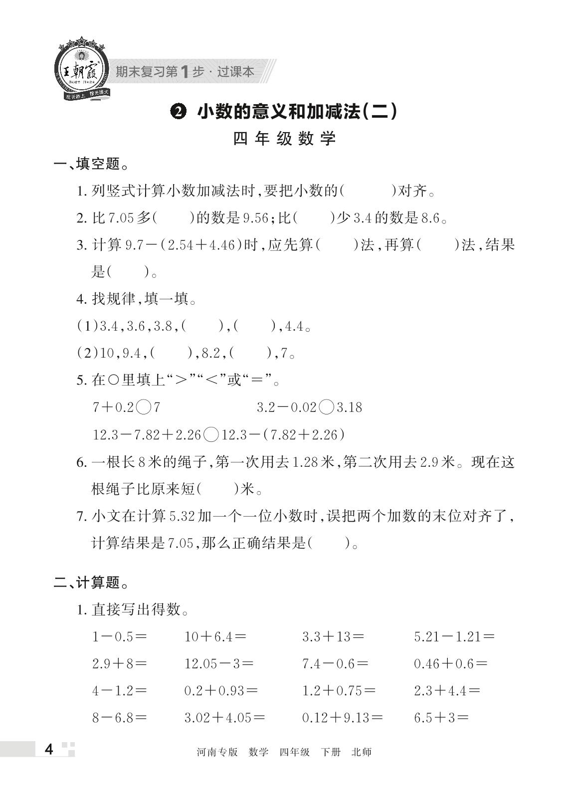 王朝霞期末过课本——2 小数的意义和加减法(二)四年级下册数学(北师版)_R220329152239950