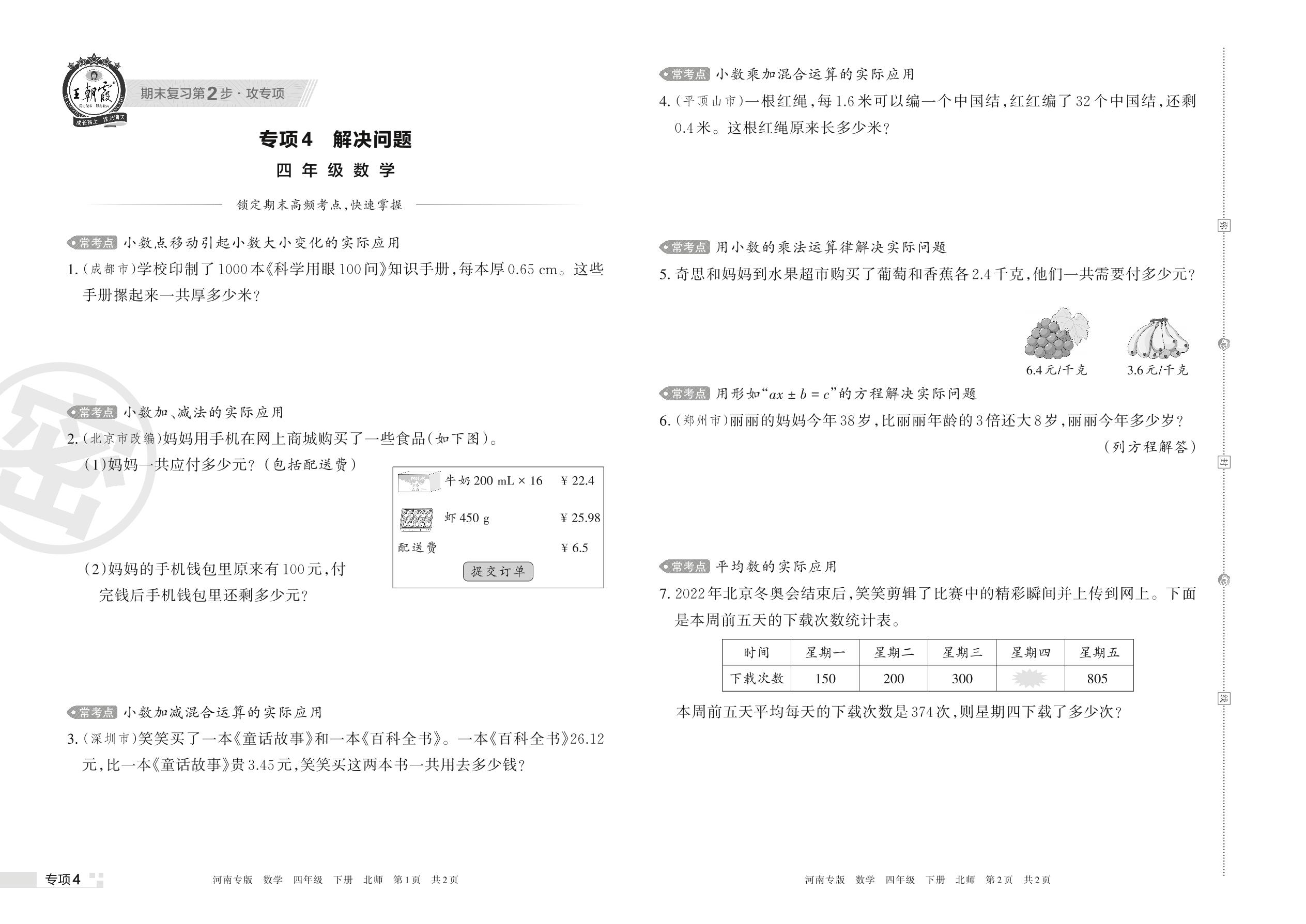 王朝霞期末专项卷——解决问题四年级下册数学(北师版)_R220329152239063【4】