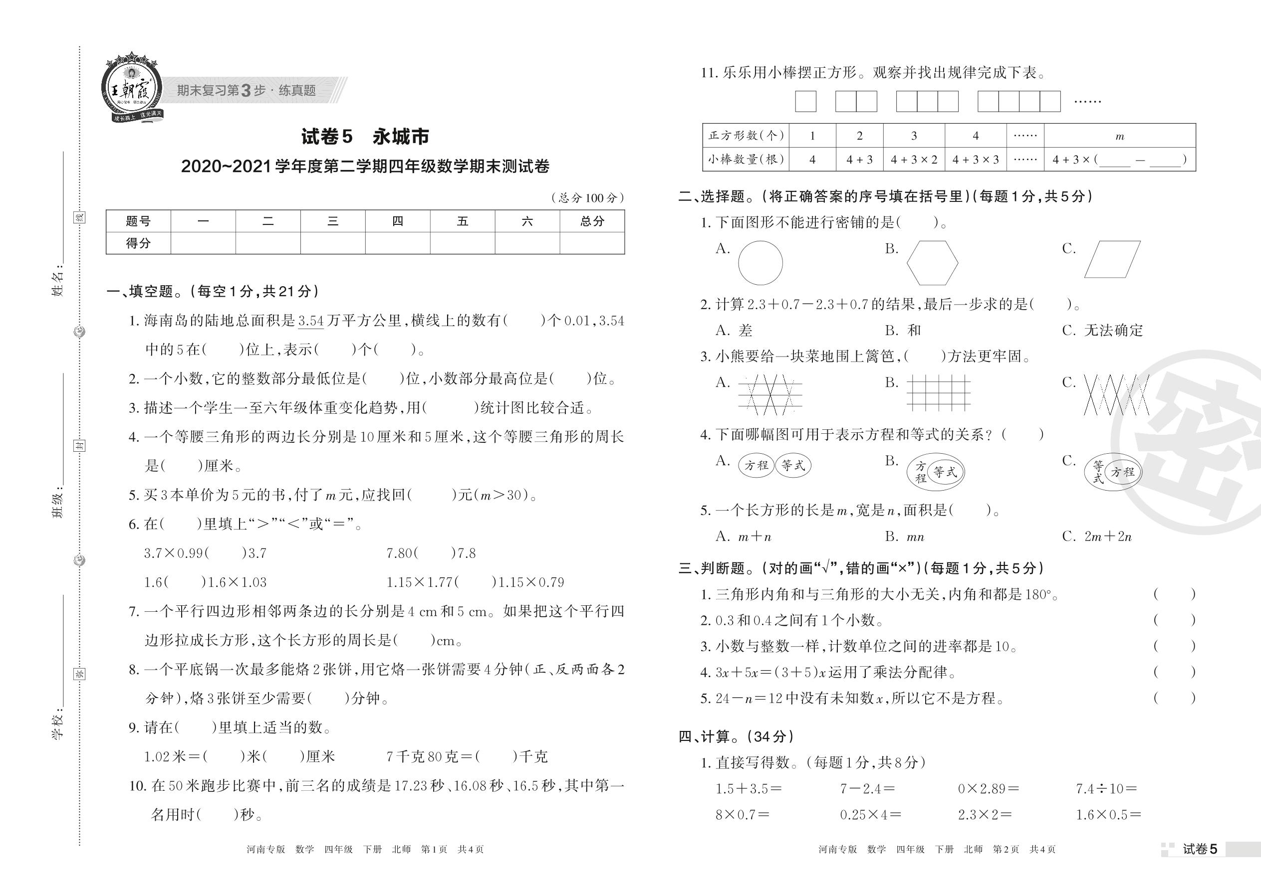 永城市2020~2021学年度第二学期四年级数学期末测试卷(北师版)【5】