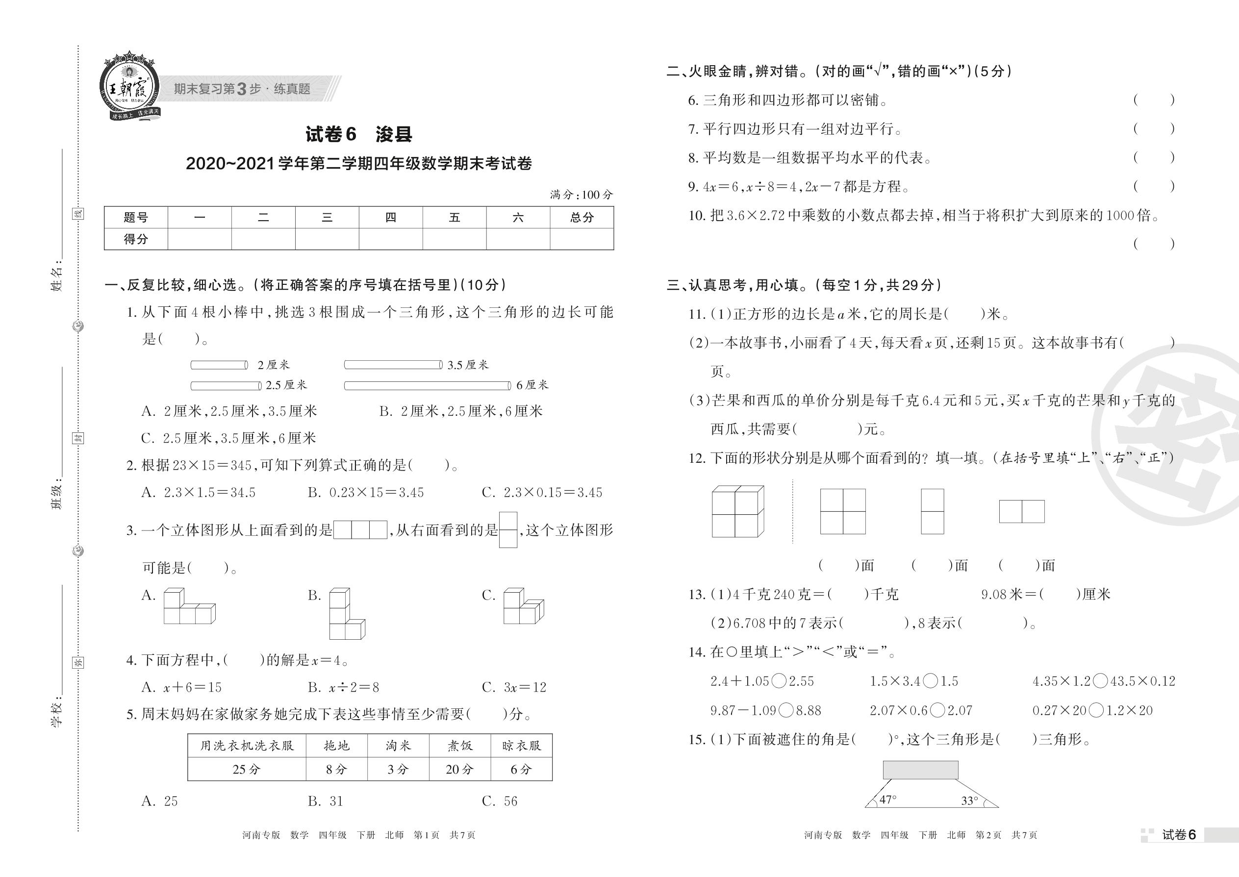 浚县2020~2021学年第二学期四年级数学期末考试卷(北师版)【6】